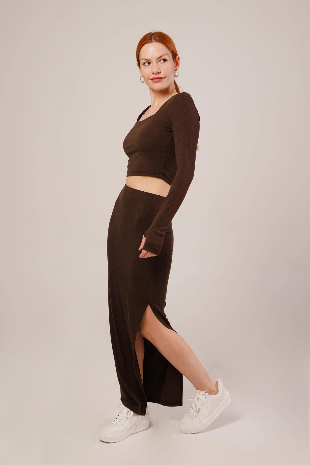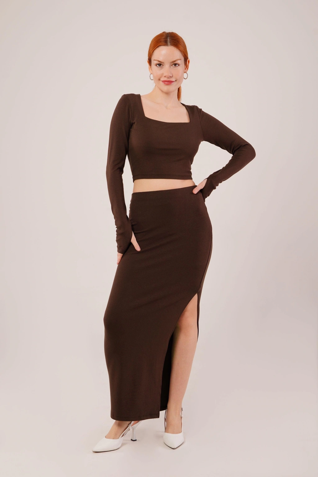 Kare Yaka Bluz Ve Yırtmaç Detaylı Etek İkili Kahverengi Takım