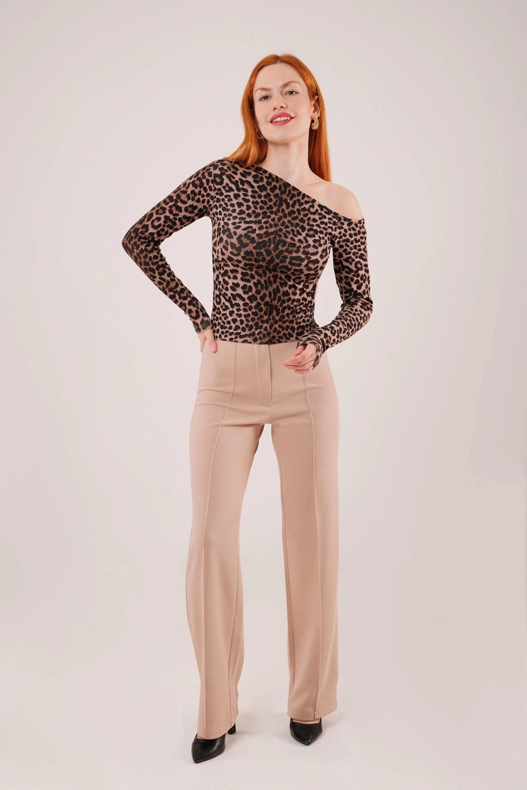 Düşük Omuz Detaylı Leopar Desen Bluz