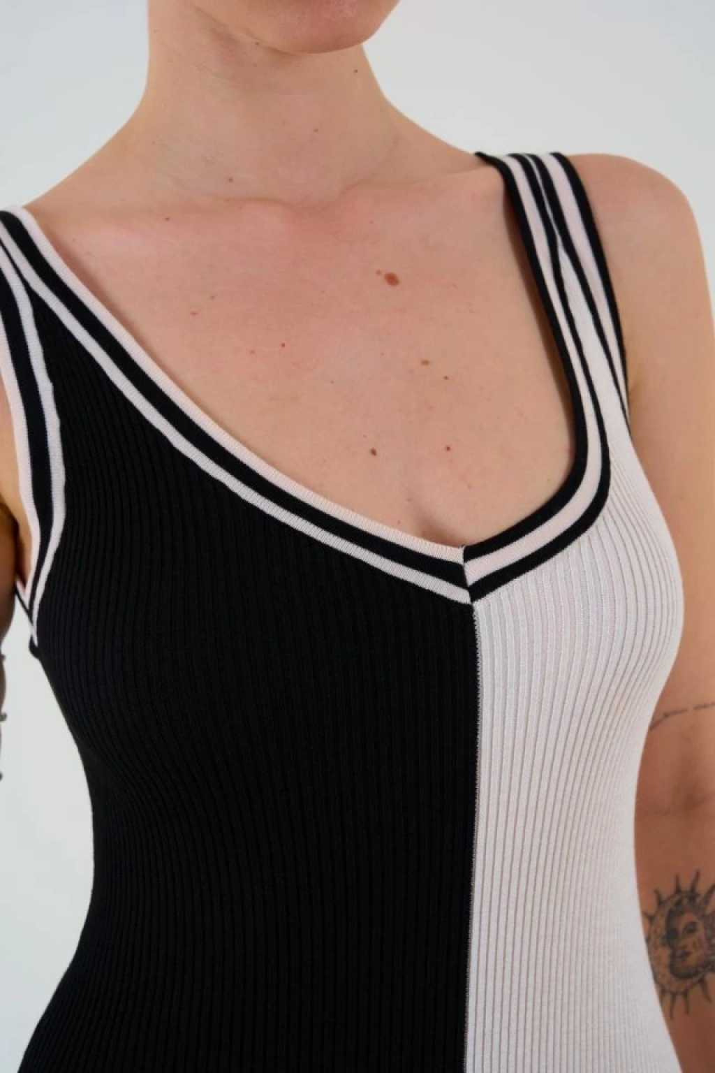 İki Renki Kolsuz Elbise - Siyah-Krem