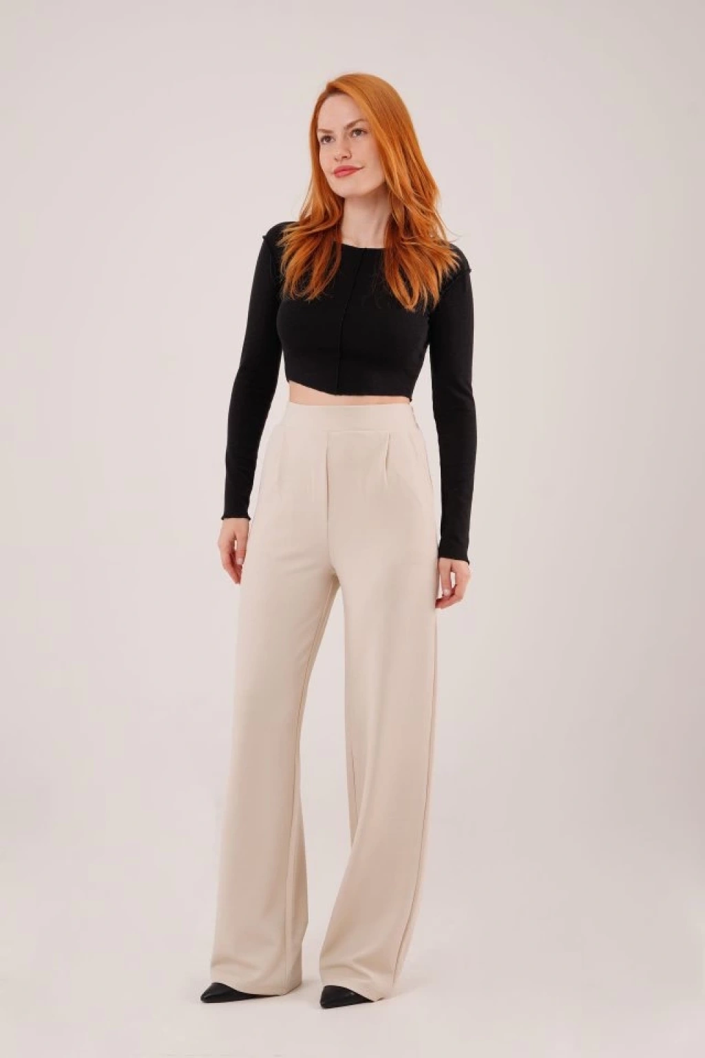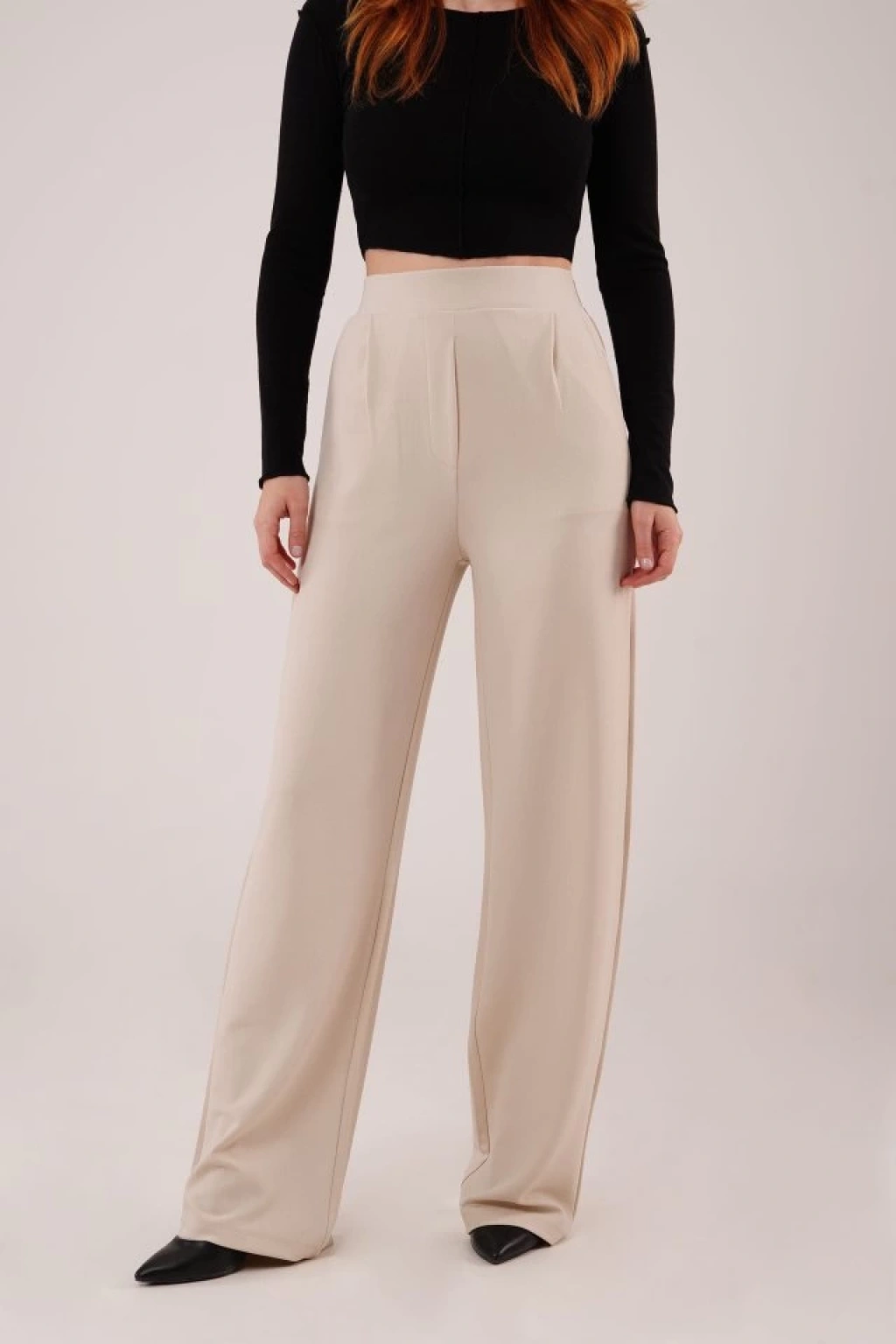 Yüksek Bel Bol Paça Krep Krem Pantolon