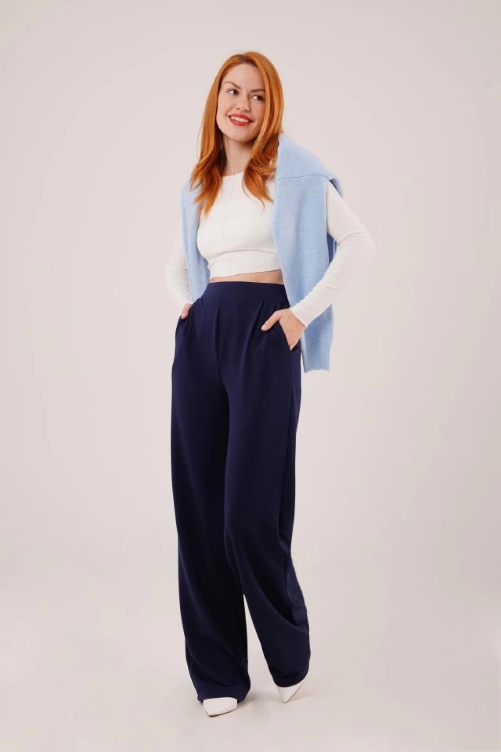 Yüksek Bel Bol Paça Krep Lacivert Pantolon
