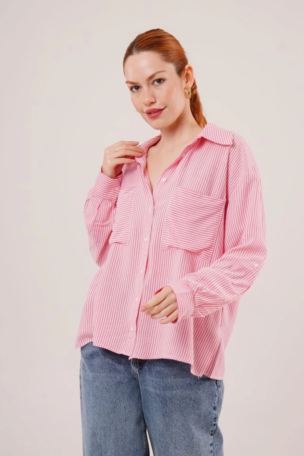 Yarasa Kol Çizgili Cep Detaylı Pembe Gömlek
