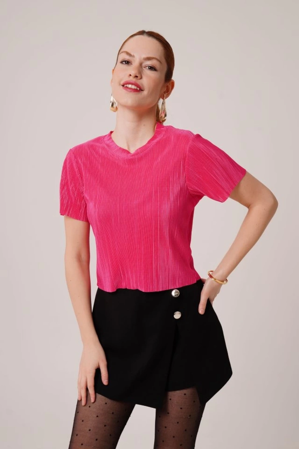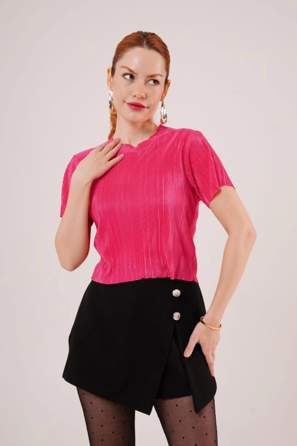 Fitilli Kısa Kollu Parlak Fuşya Bluz