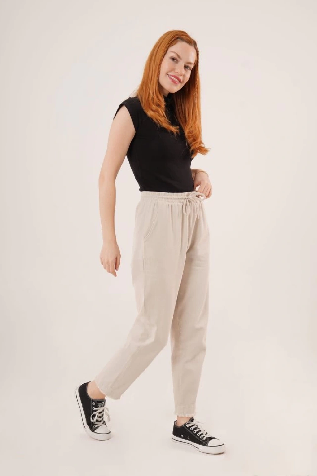 Cepli Belden Bağlamalı Paça Detaylı Krem Pantolon