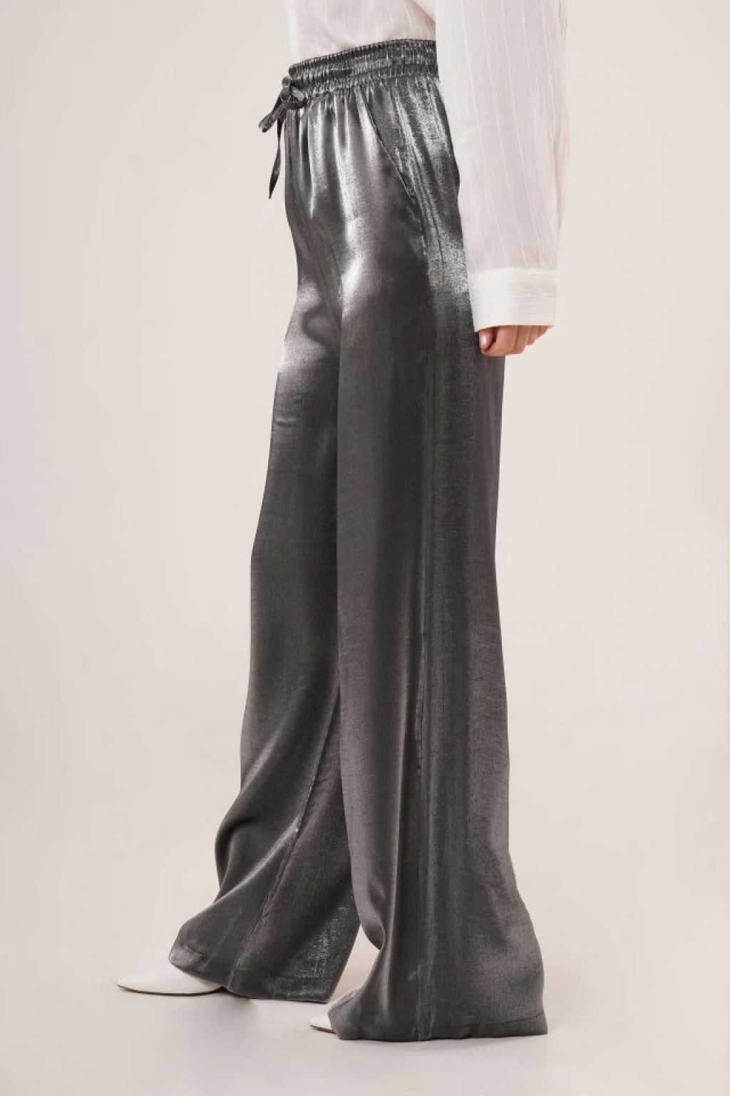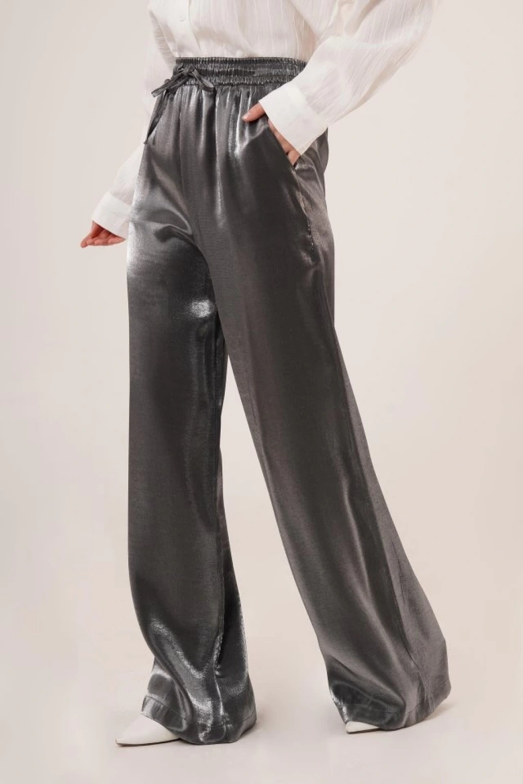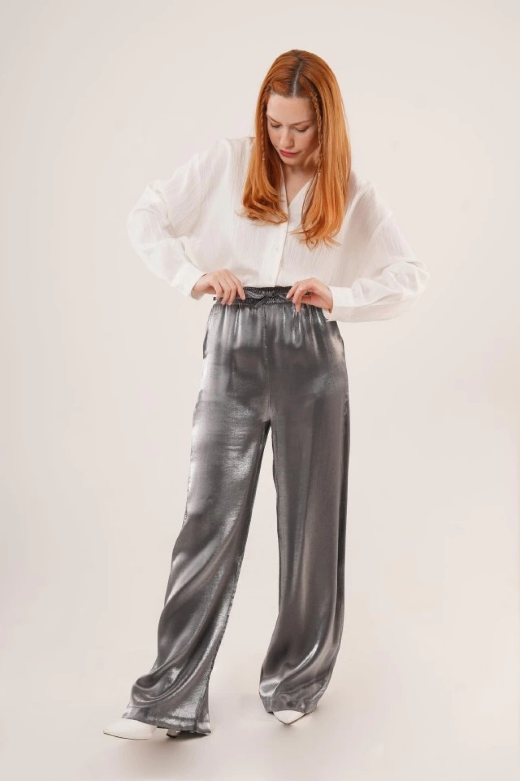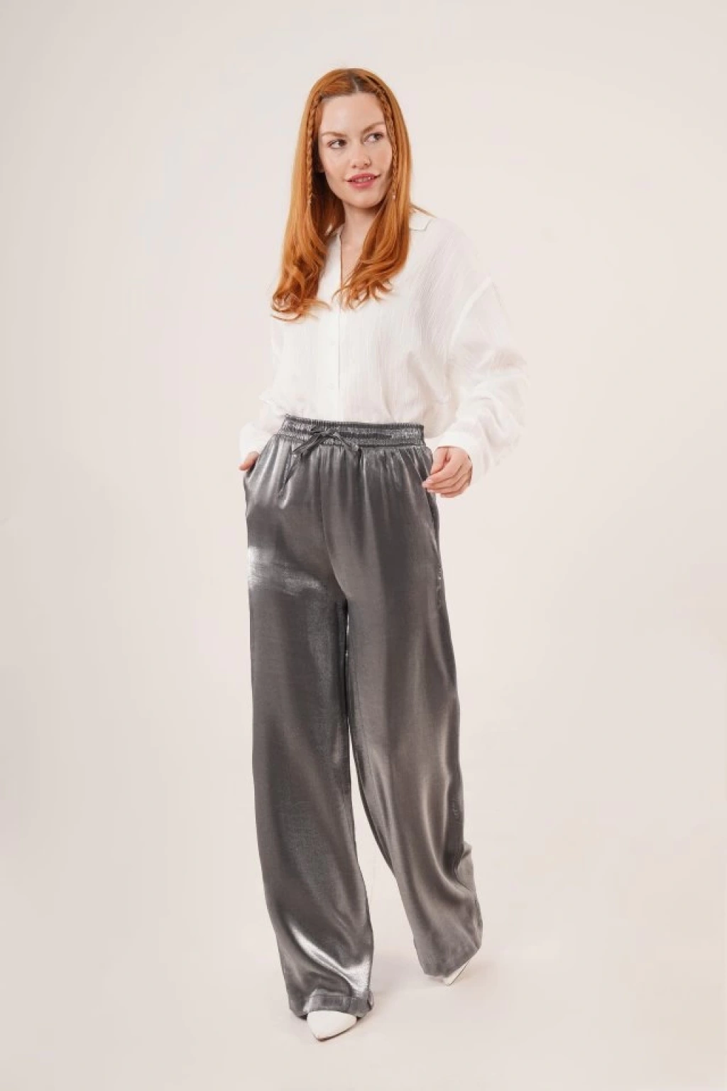 Parlak Görünümlü Cepli Antrasit Bol Paça Pantolon