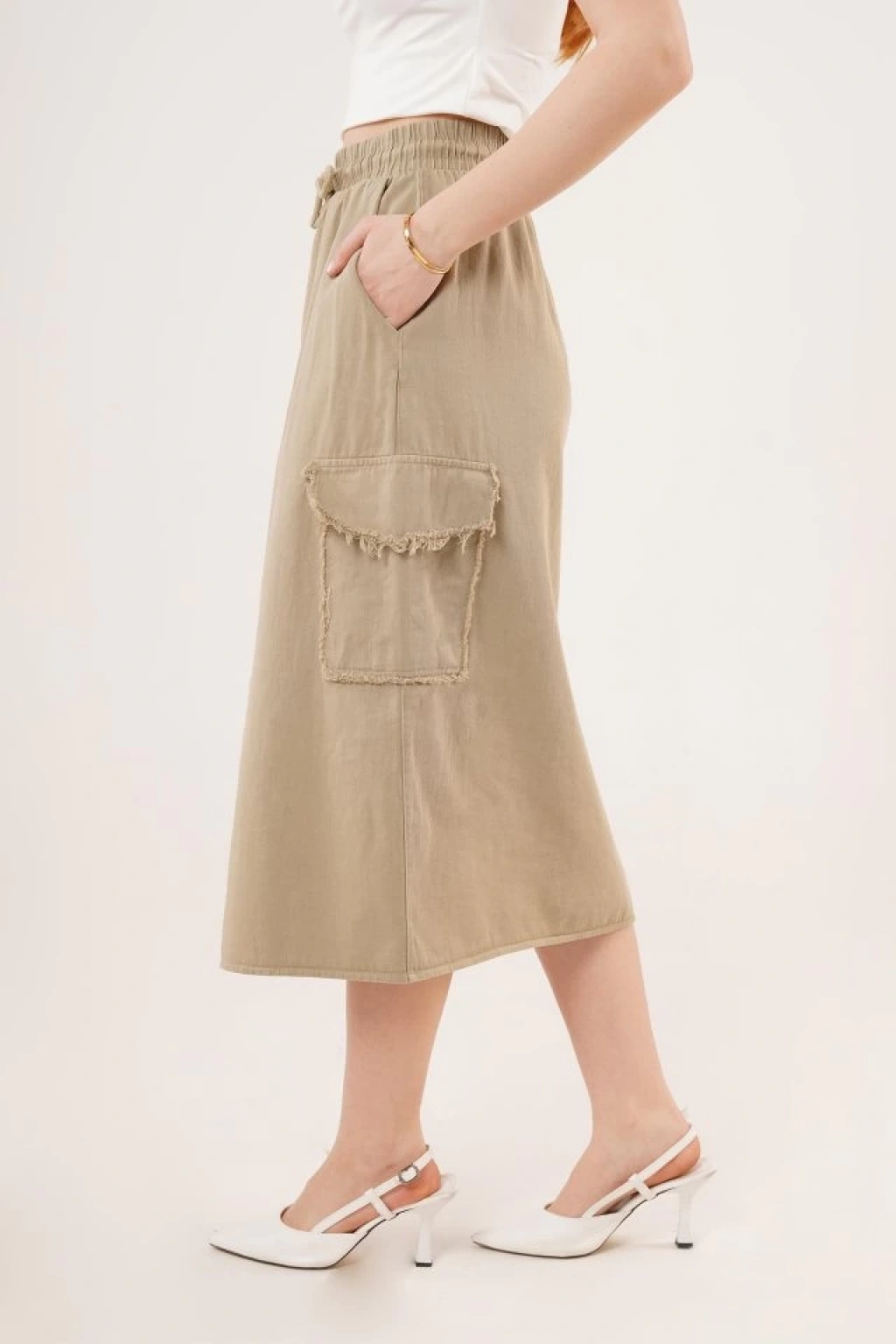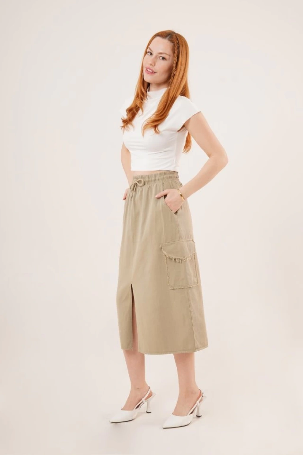 Ön Yırtmaçlı Cep Detaylı Haki Etek