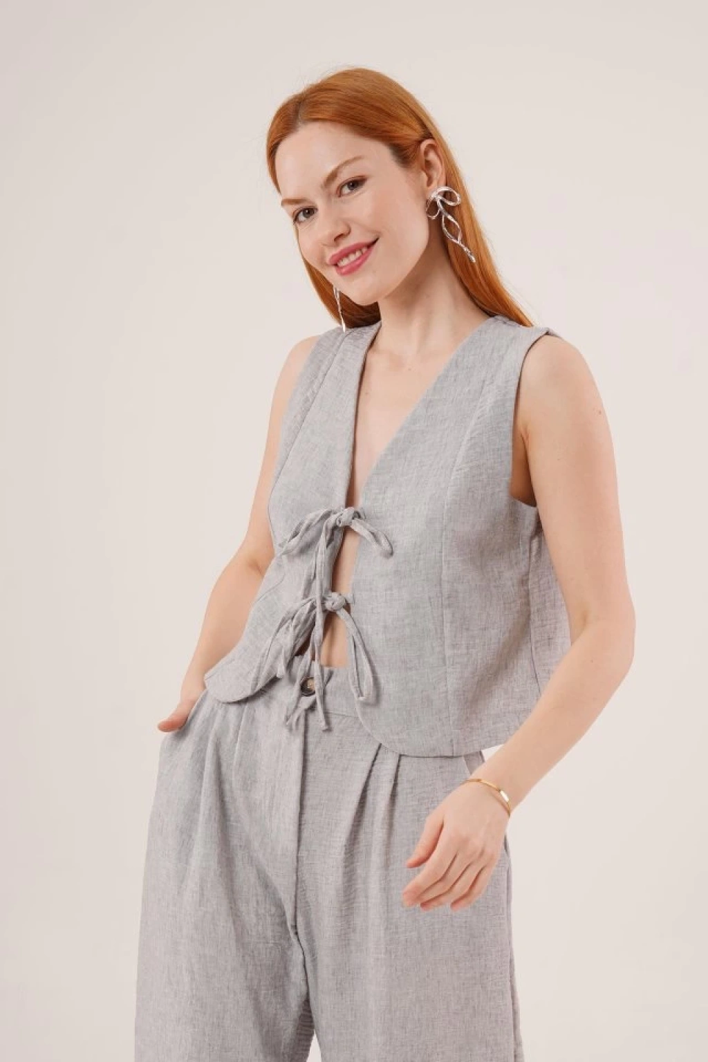 Ön Bağlama Detaylı Yelek Ve Pantolon Gri İkili Takım