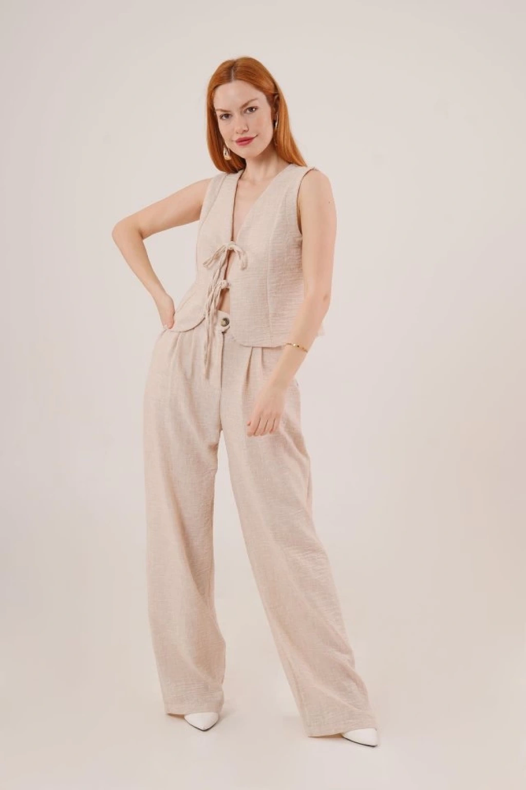 Ön Bağlama Detaylı Yelek Ve Pantolon Taş İkili Takım