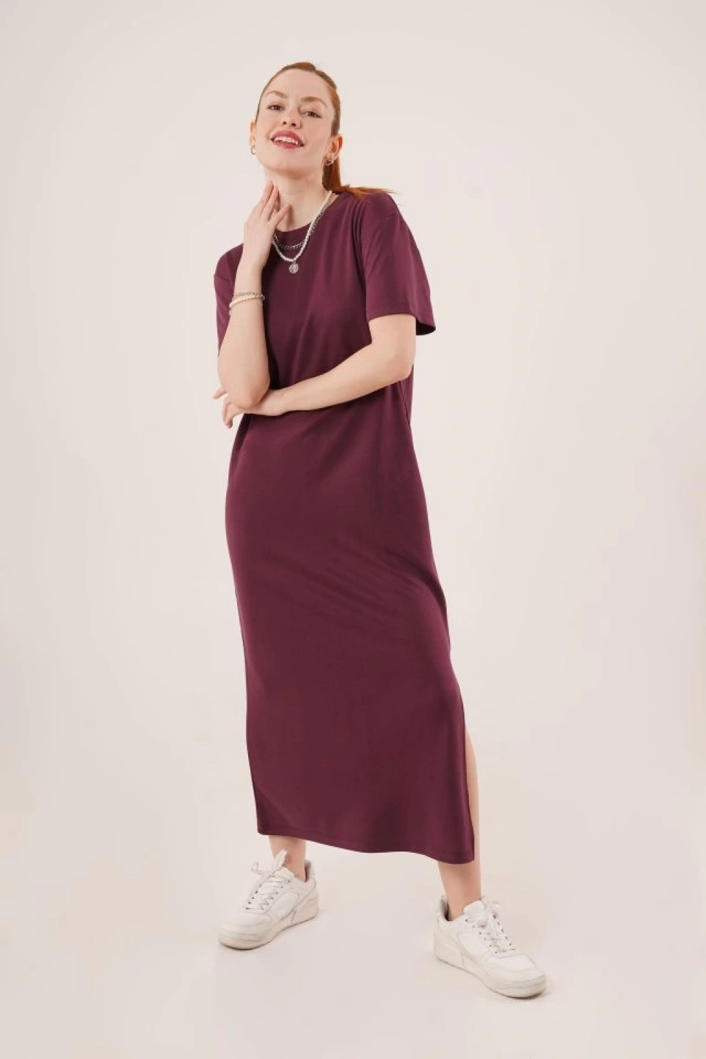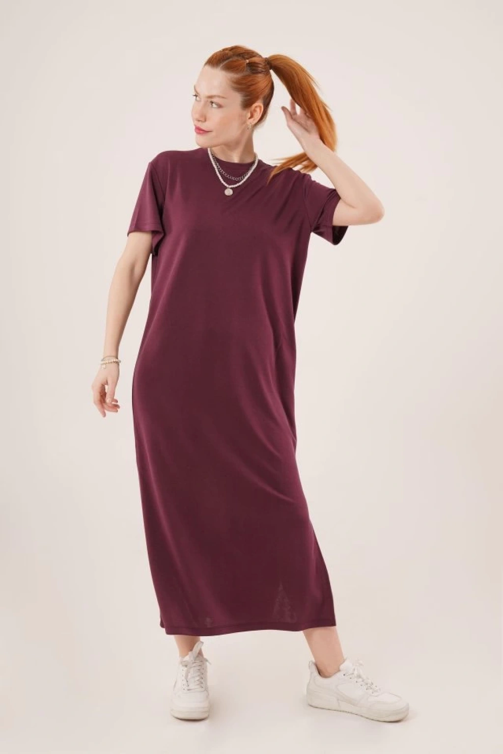 Yırtmaç Detaylı Kısa Kollu Salaş Maxi Bordo Elbise