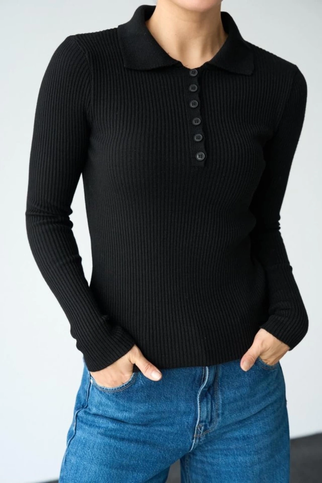 Polo Yaka 6 Düğmeli Kazak - Siyah