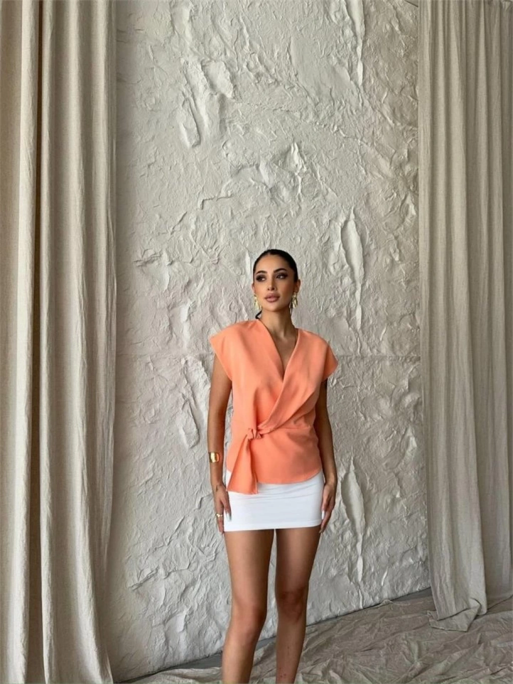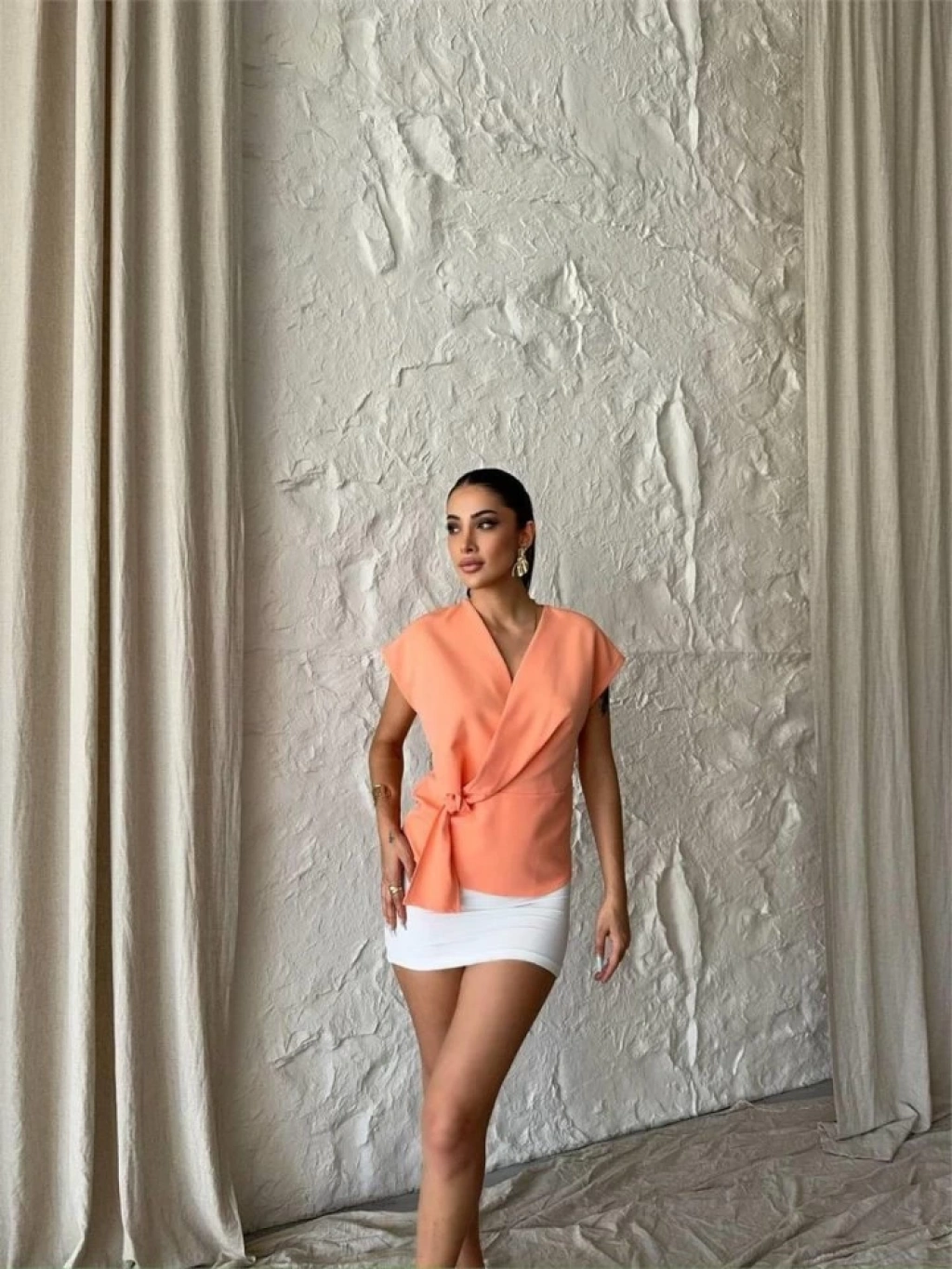 YANDAN BAĞLAMA DETAYLI KOLSUZ BLUZ - Somon