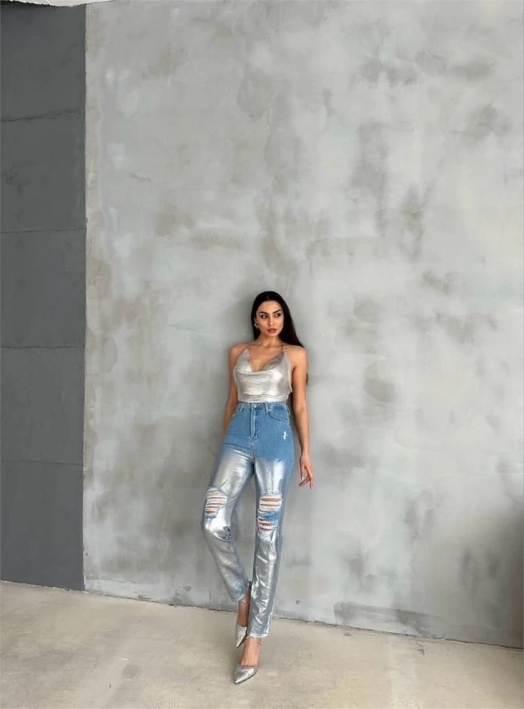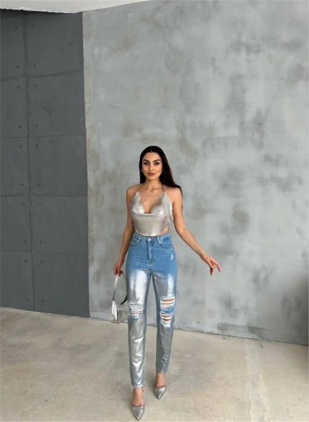 DİZ YIRTIK VARAKLI MOM KOT PANTOLON - Gümüş