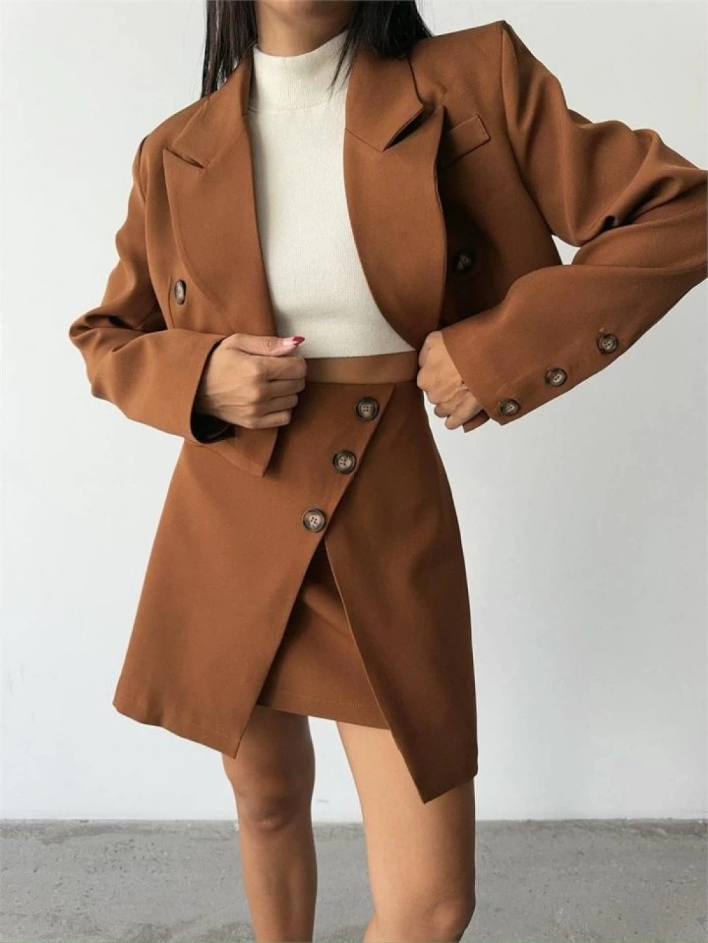 DÜĞME DETAYLI ETEK - CROP CEKET TAKIM - Kahverengi