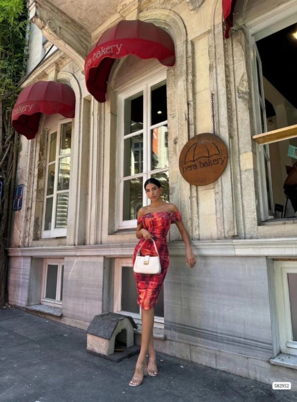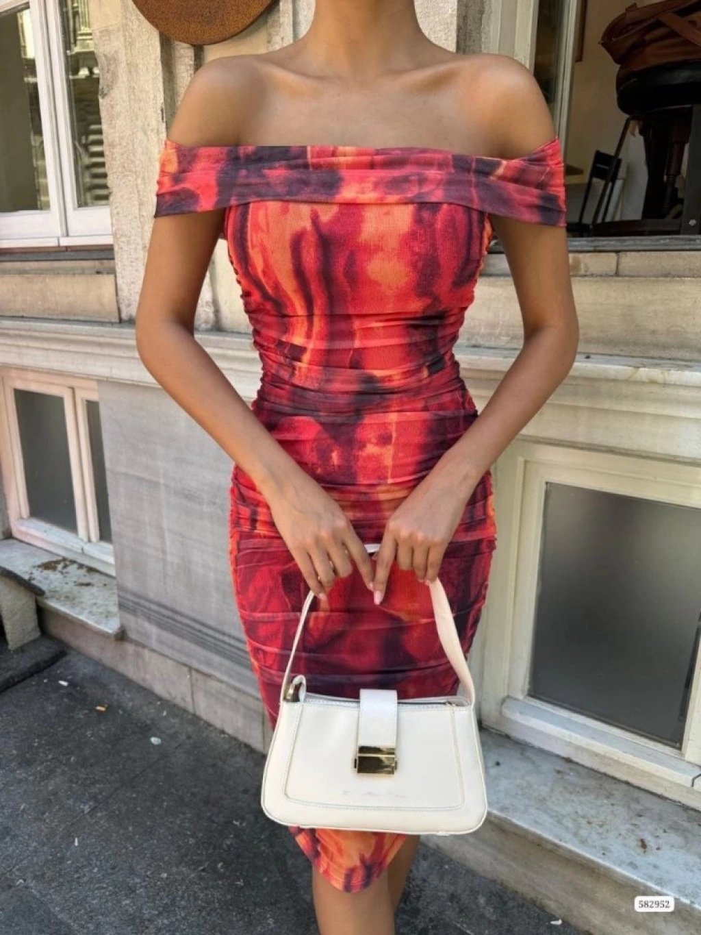 Kadın Madonna Yaka Dalga Desen Midi Boy şifon Elbise