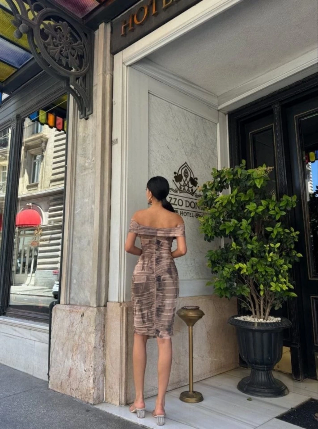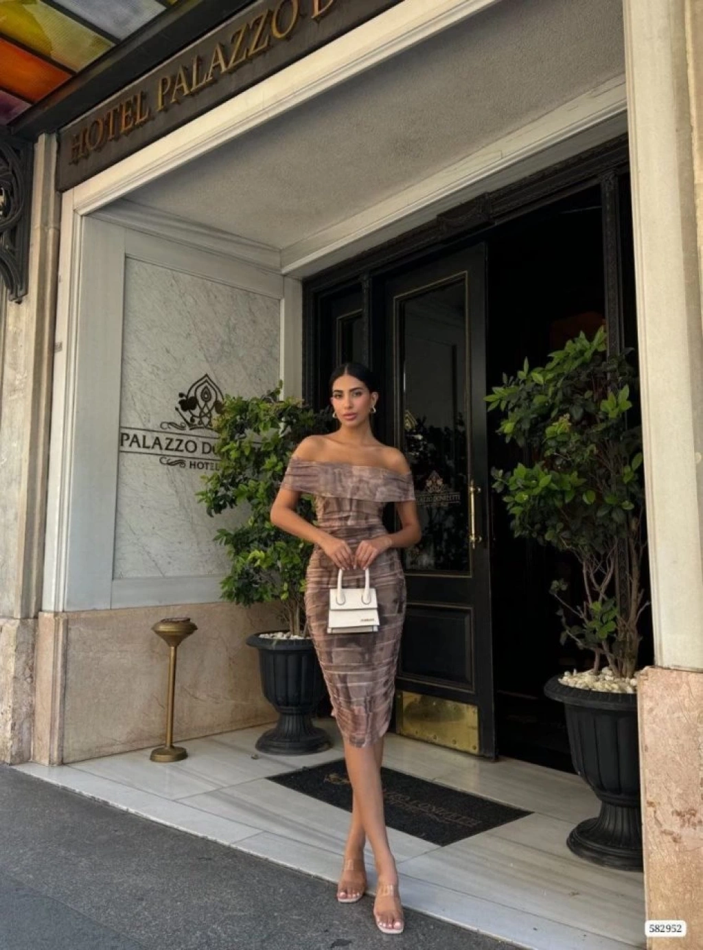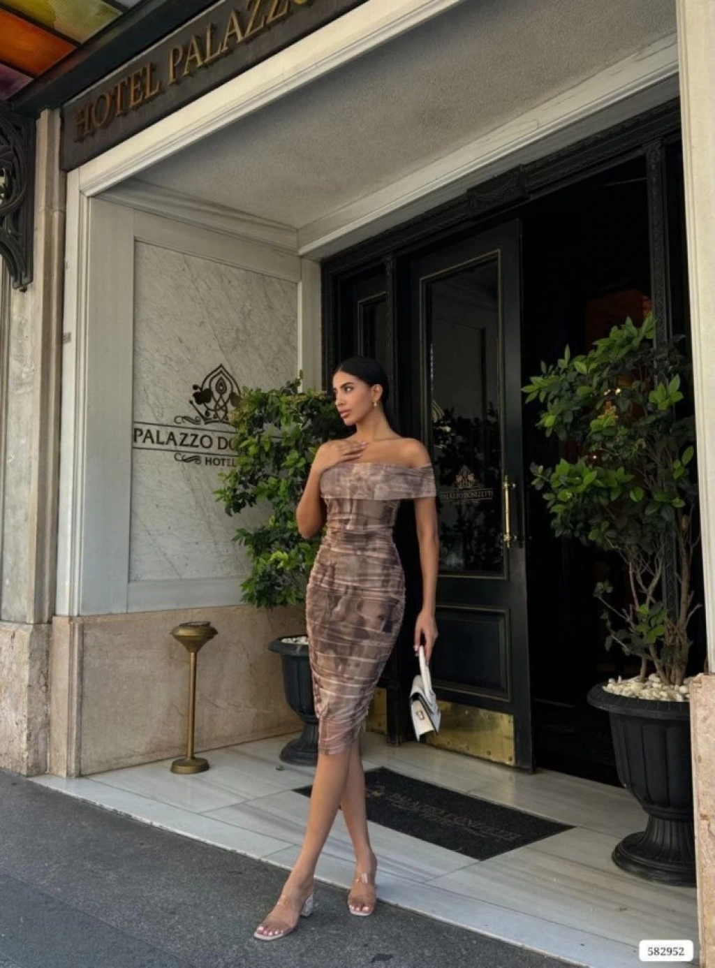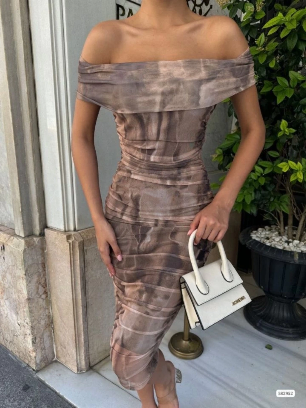 Kadın Madonna Yaka Dalga Desen Midi Boy şifon Elbise