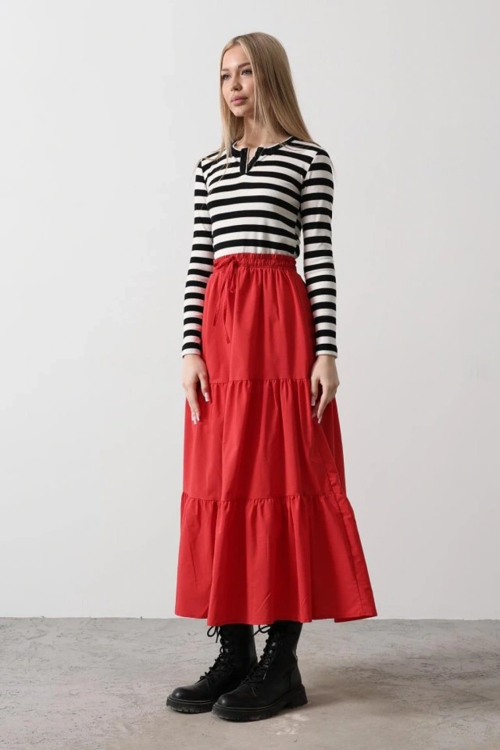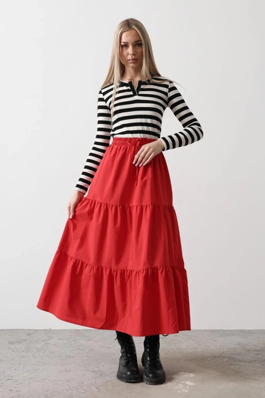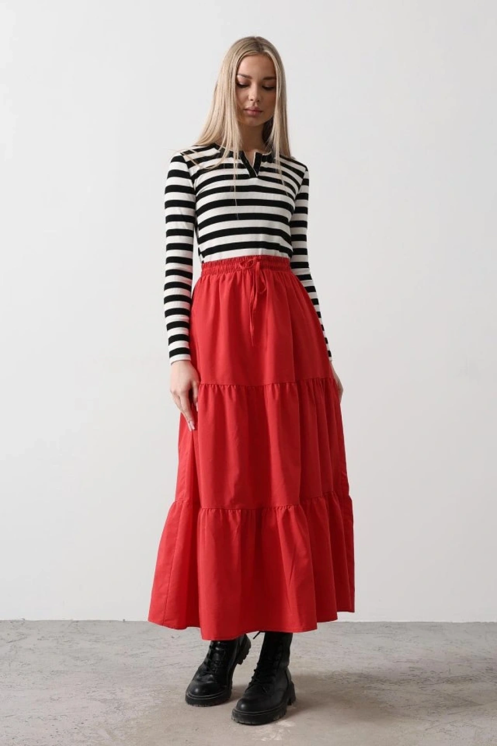 Pamuklu Beli Lastikli Etek - Kırmızı