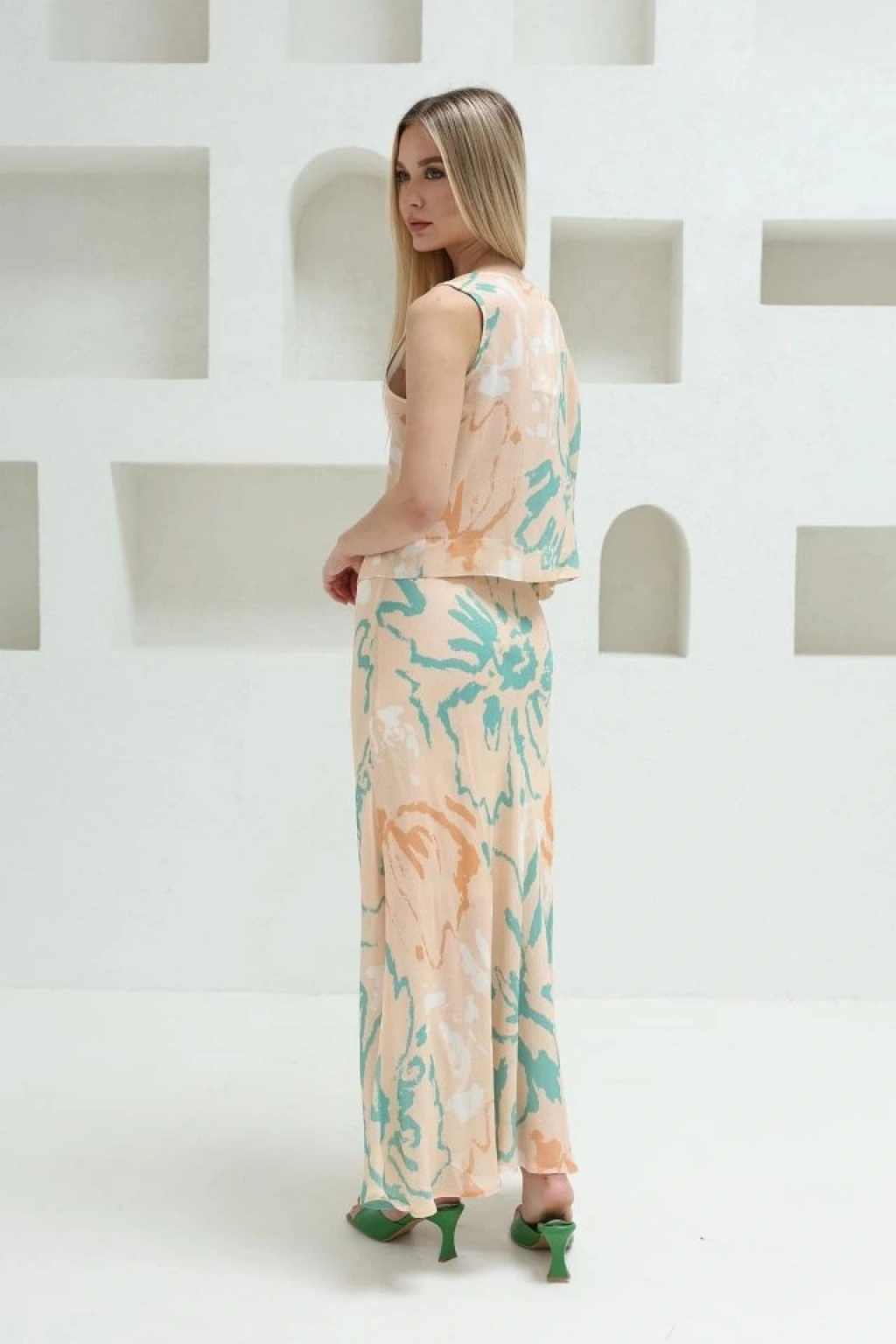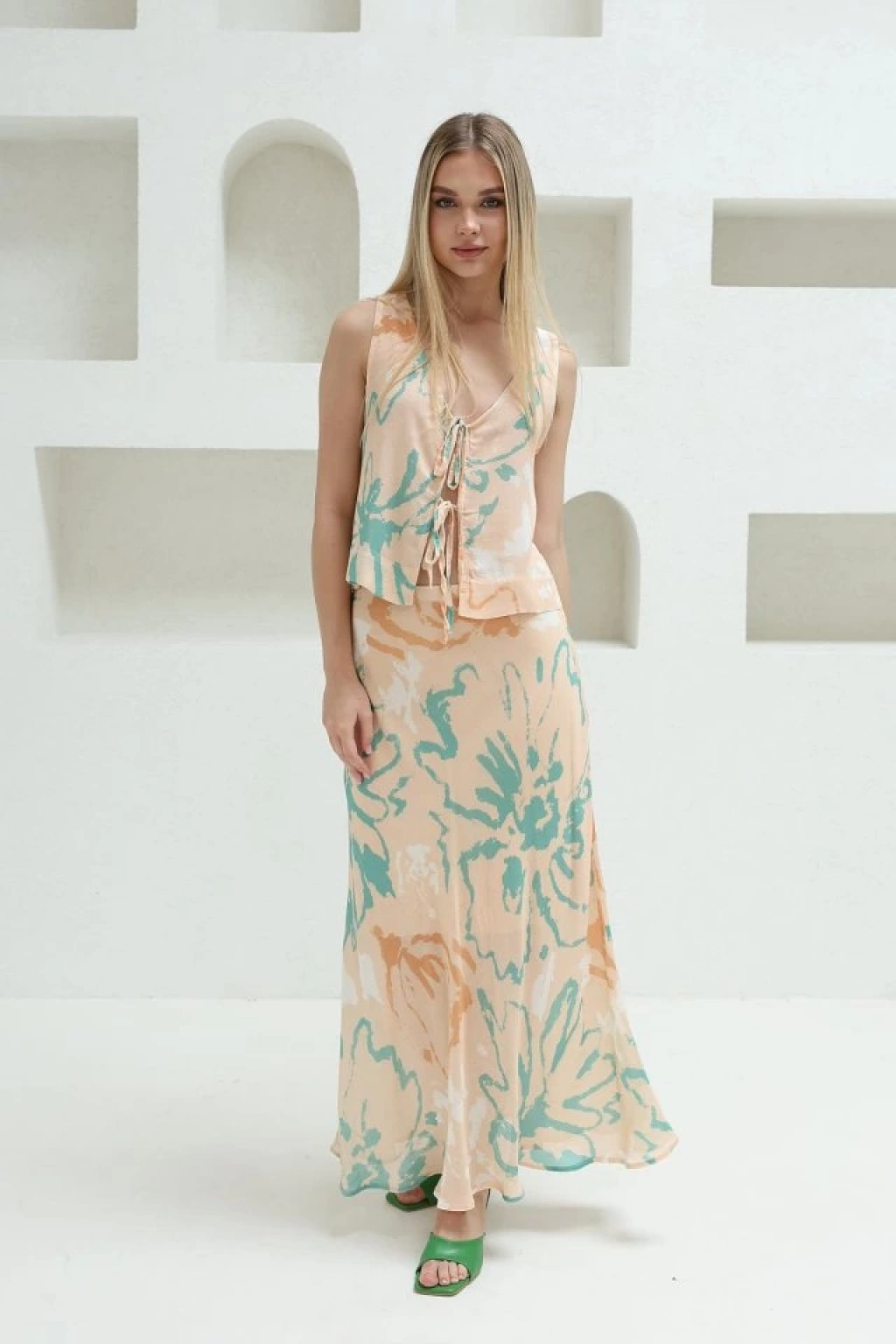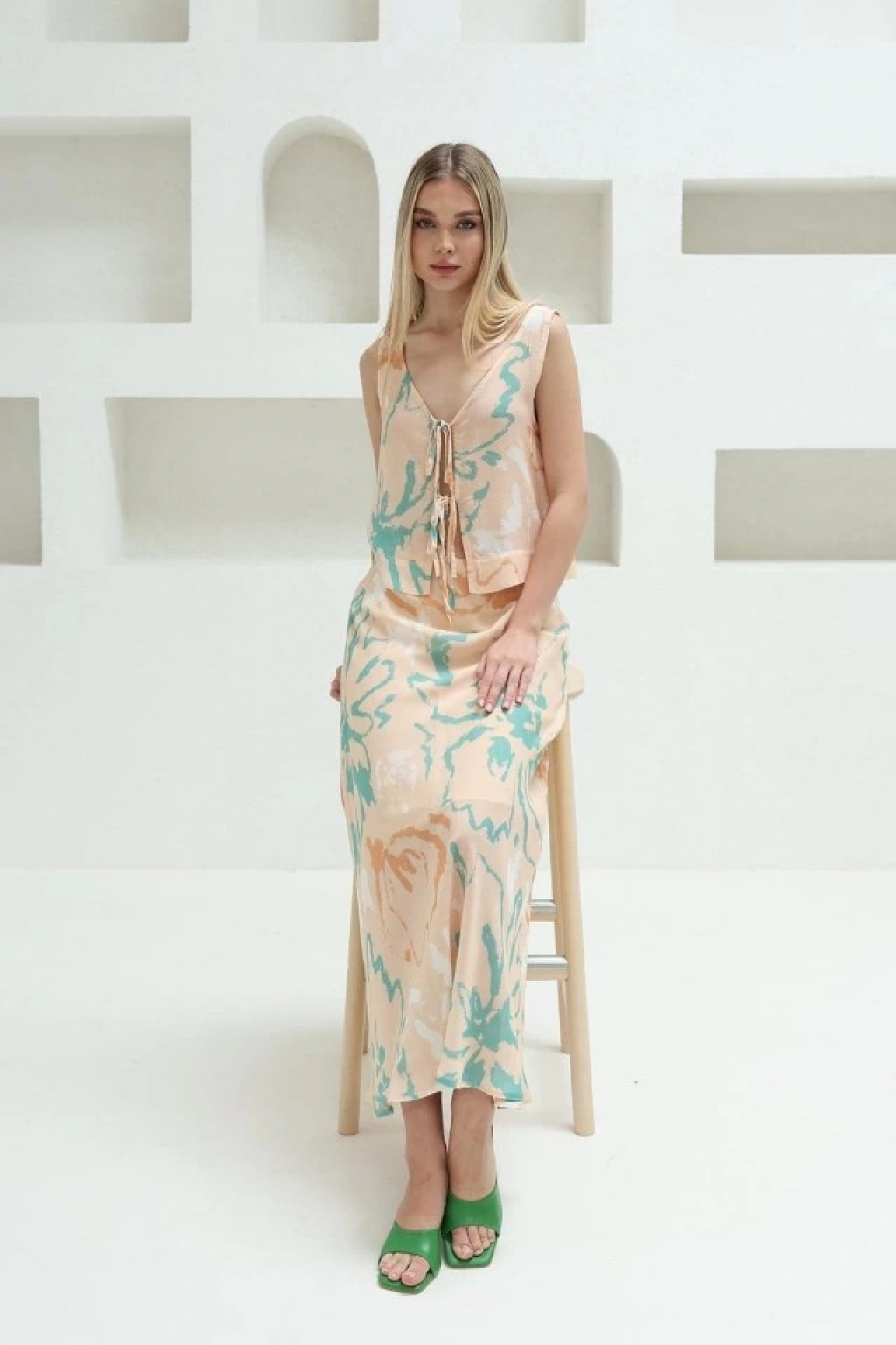 Bağcıklı Bluzlu Etek Takım - Pudra