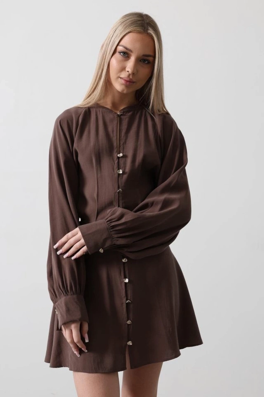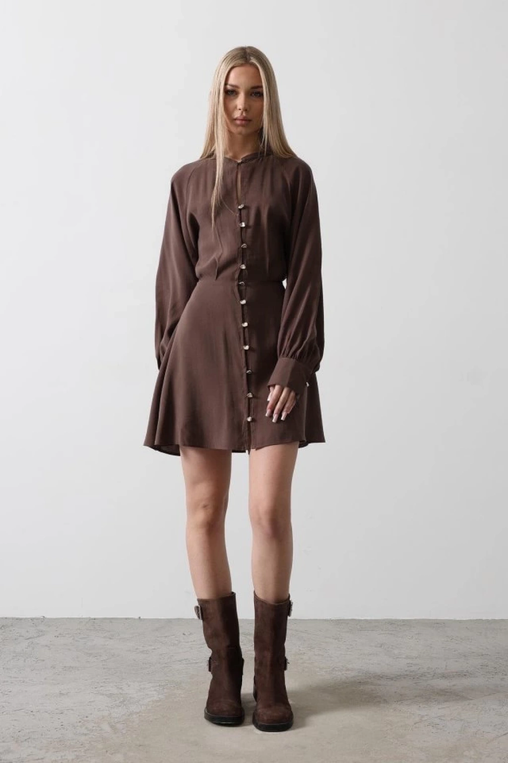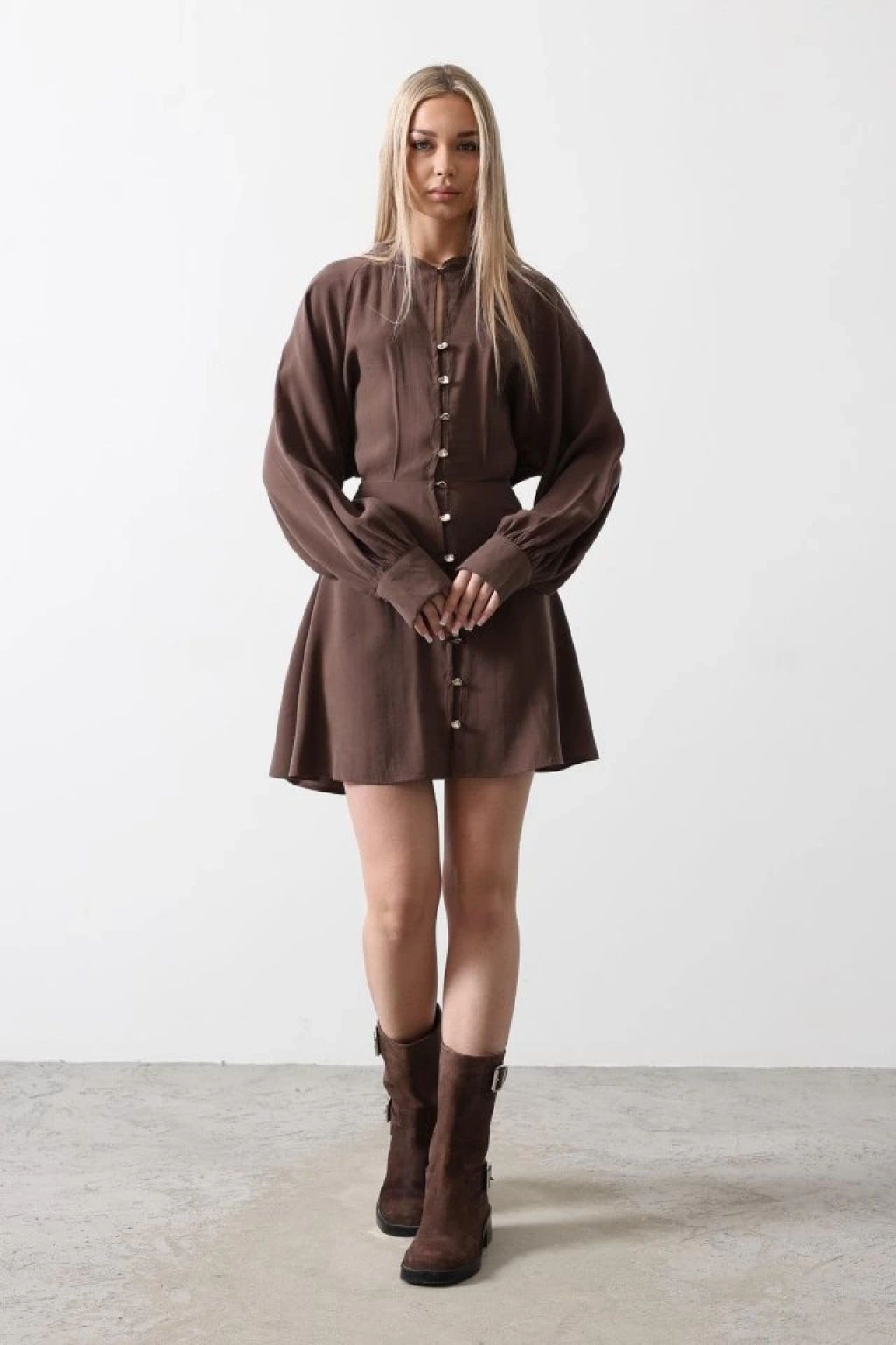 Gold Rengi Düğme Detaylı Elbise - Kahve