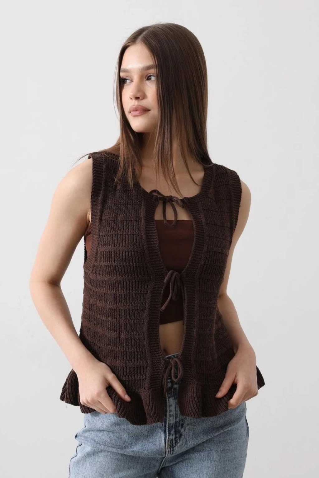 Önü Bağlamalı Yelek - Kahve