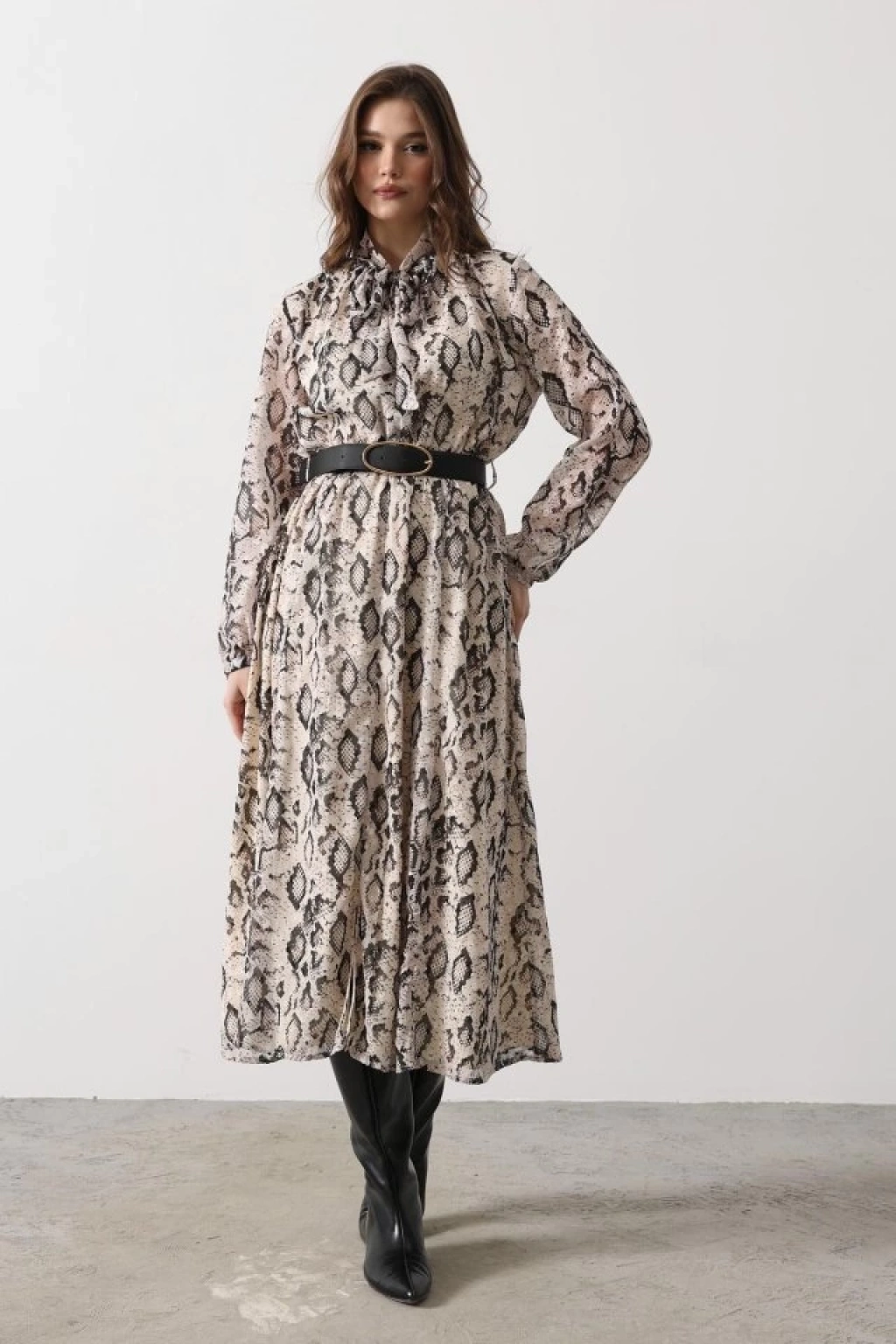 Yılan Desen Uzun Yaka Detaylı Elbise - Krem-Siyah
