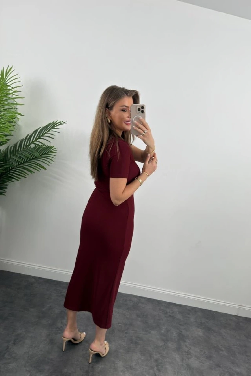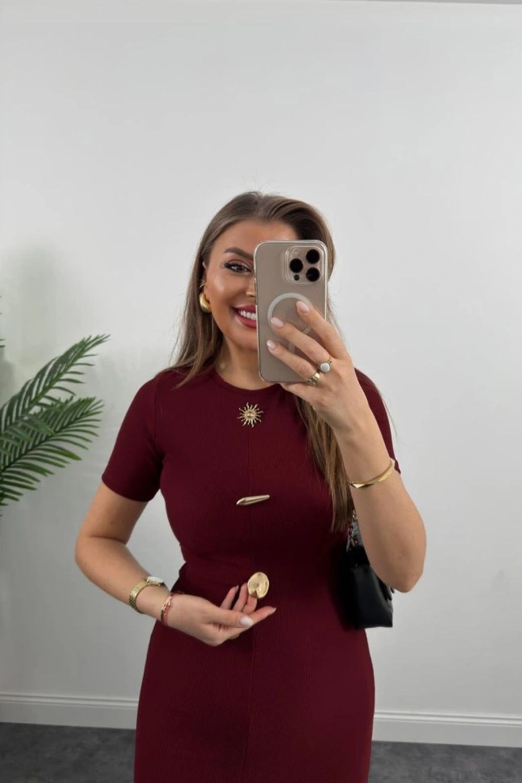 Kadın Ottoman Kumaş Likralı Düğme Tasarımlı Kısa Kol Kalem Elbise