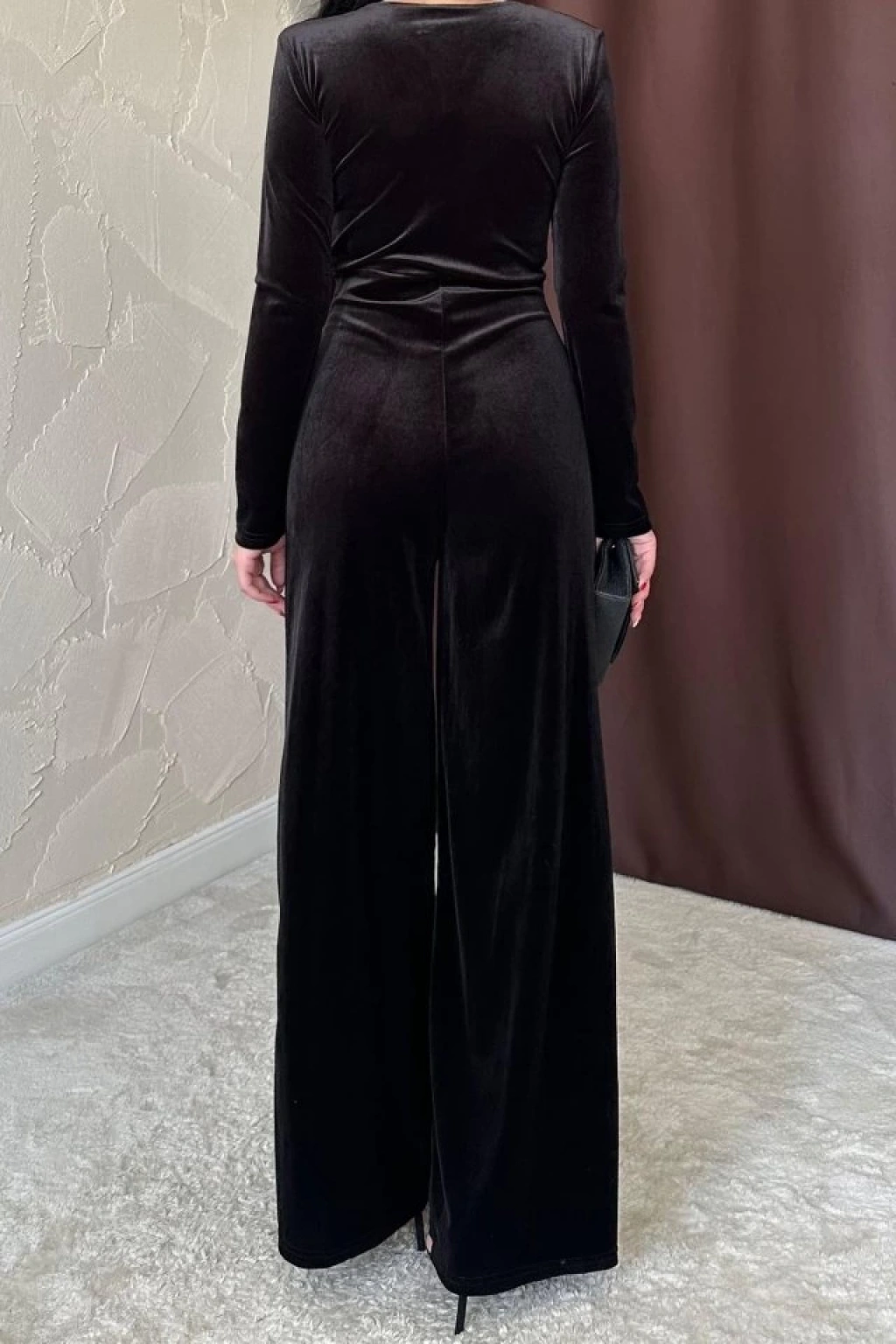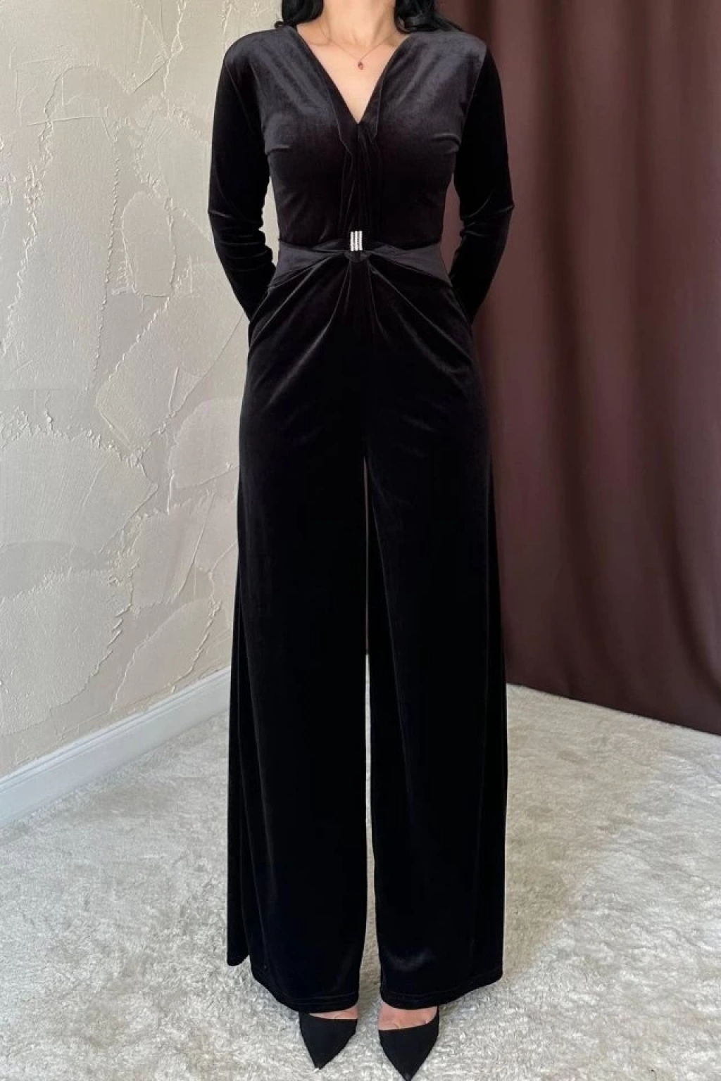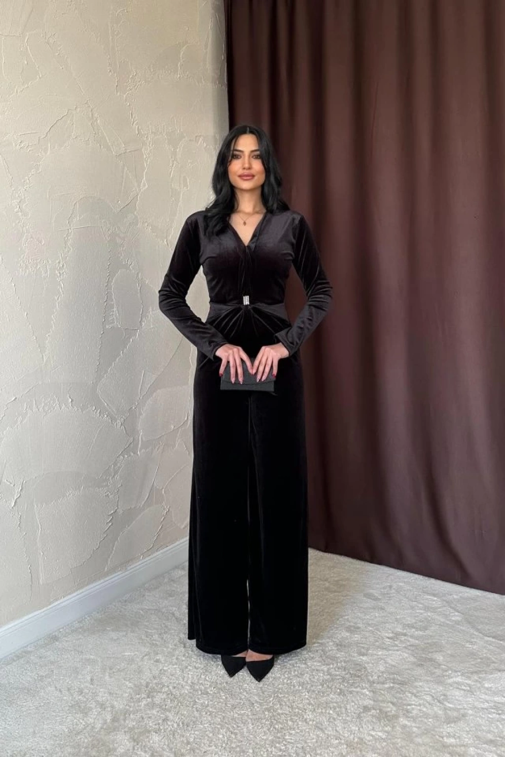Siyah Önü Tokalı Kadife Tulum