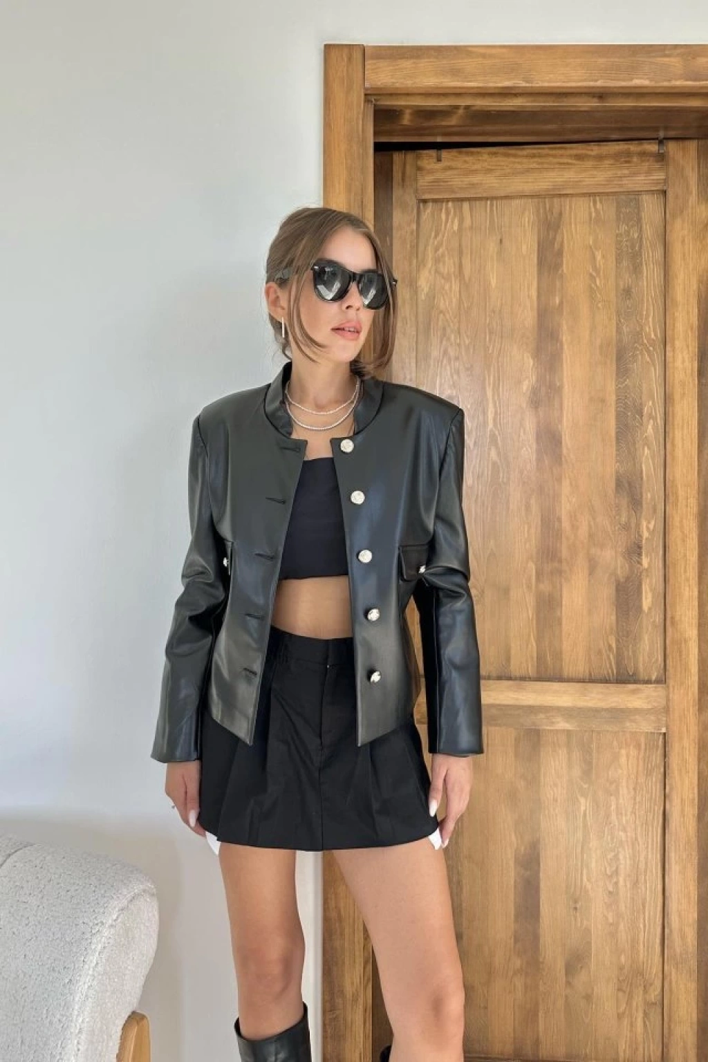 Siyah Önü Düğme Kapamalı Deri Ceket
