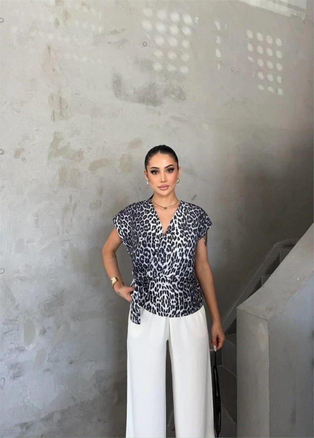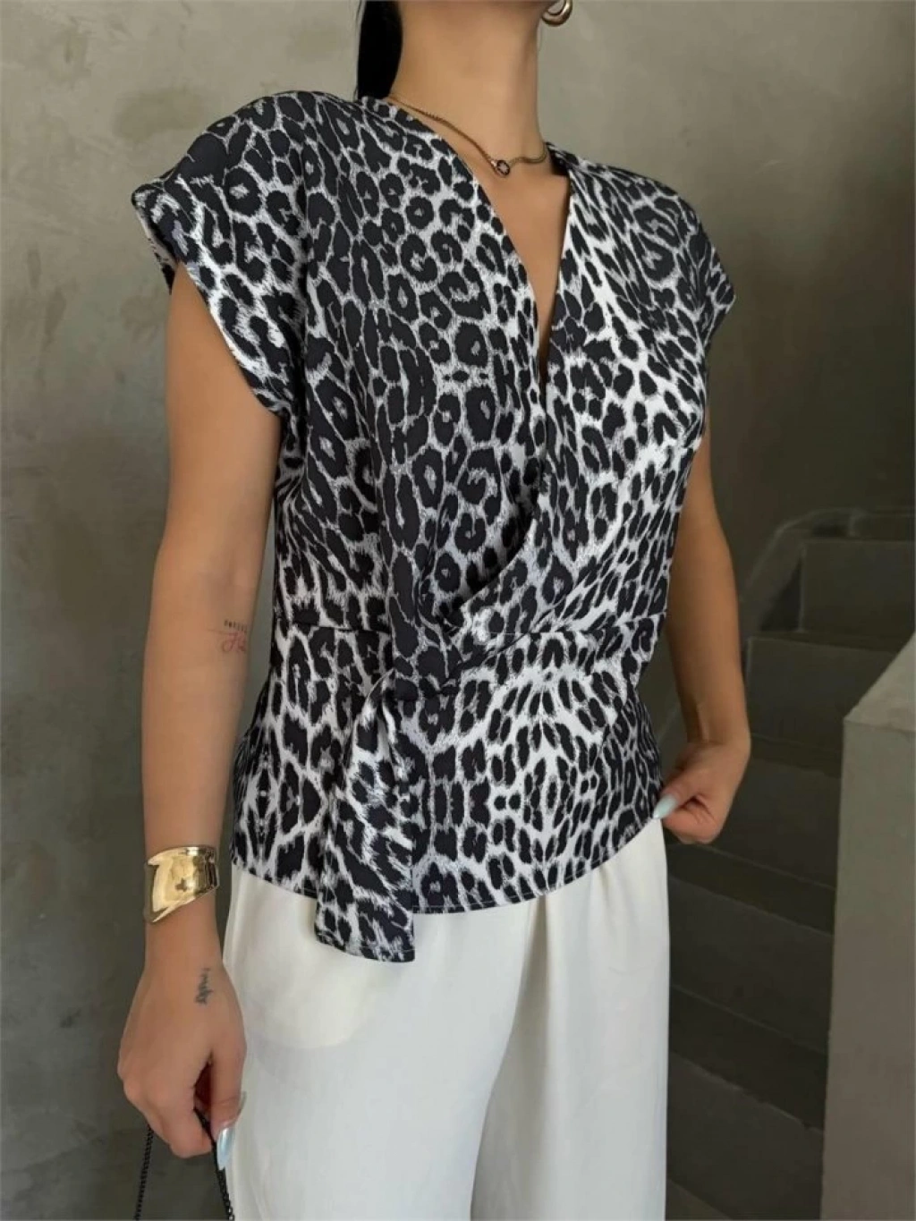 LEOPAR DESEN YANDAN BAĞLAMA DETAYLI BLUZ - Gri
