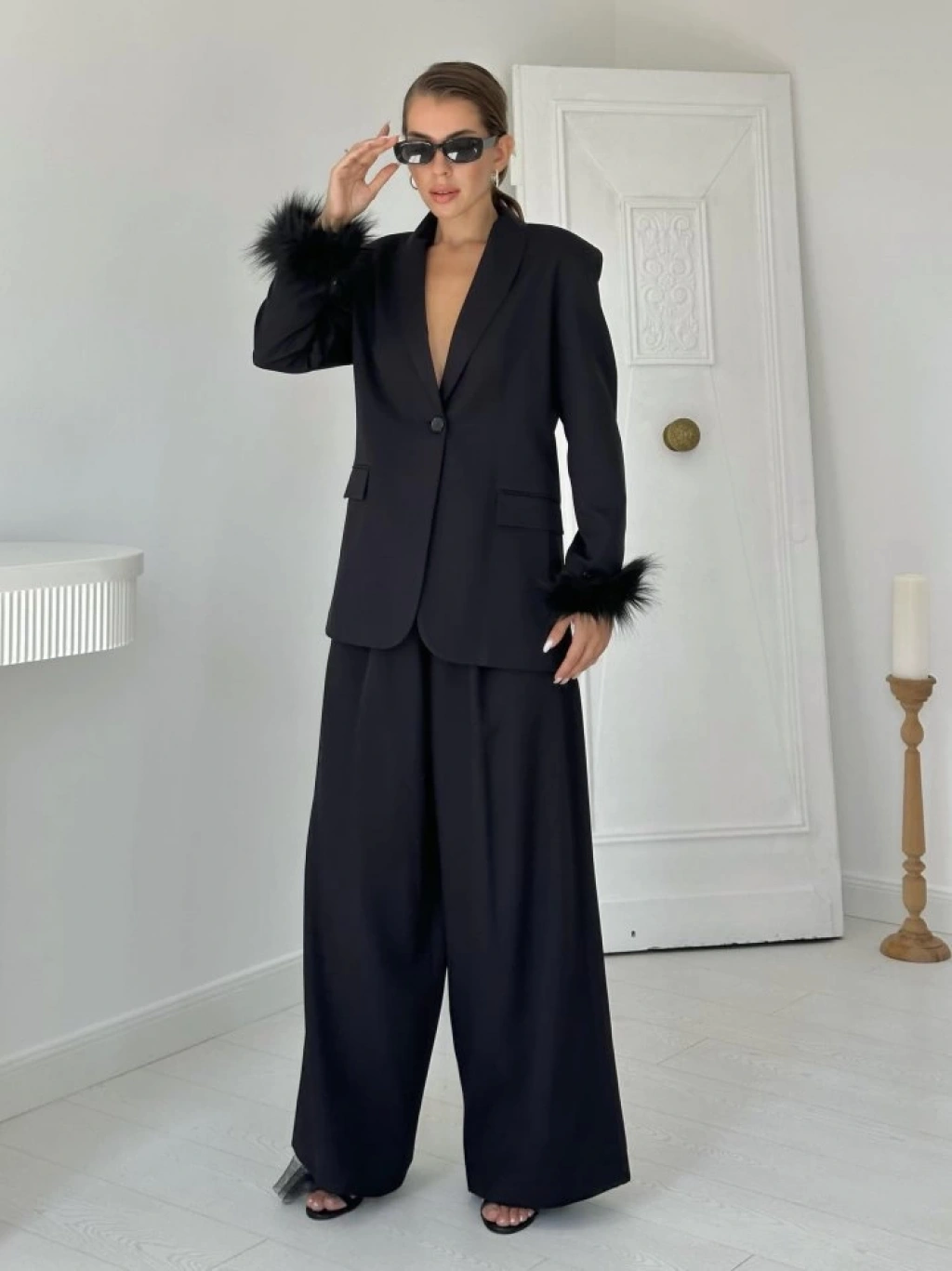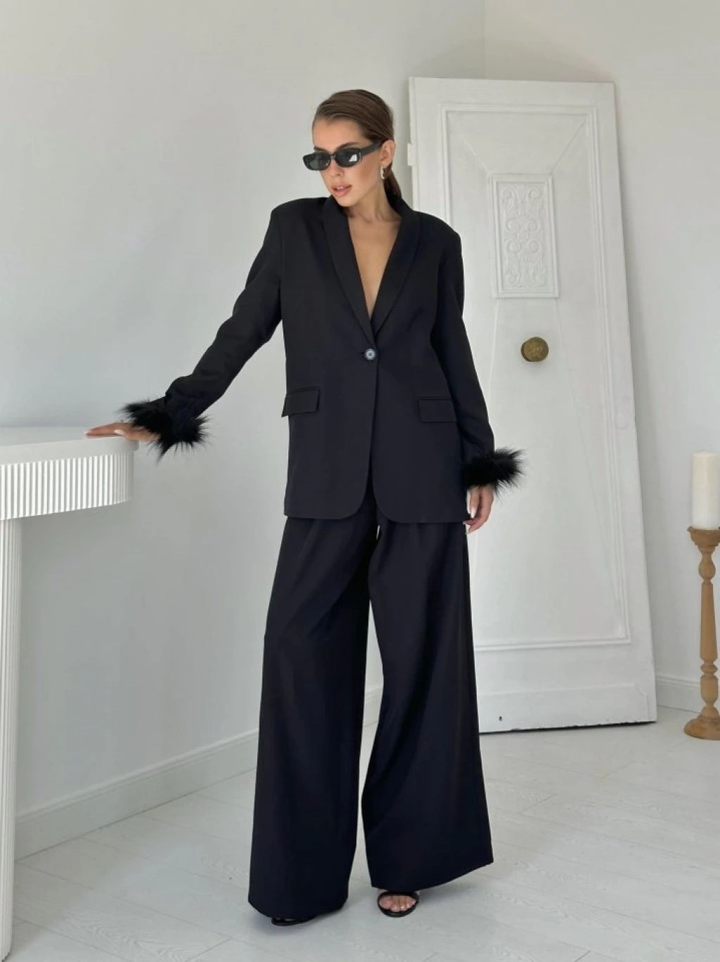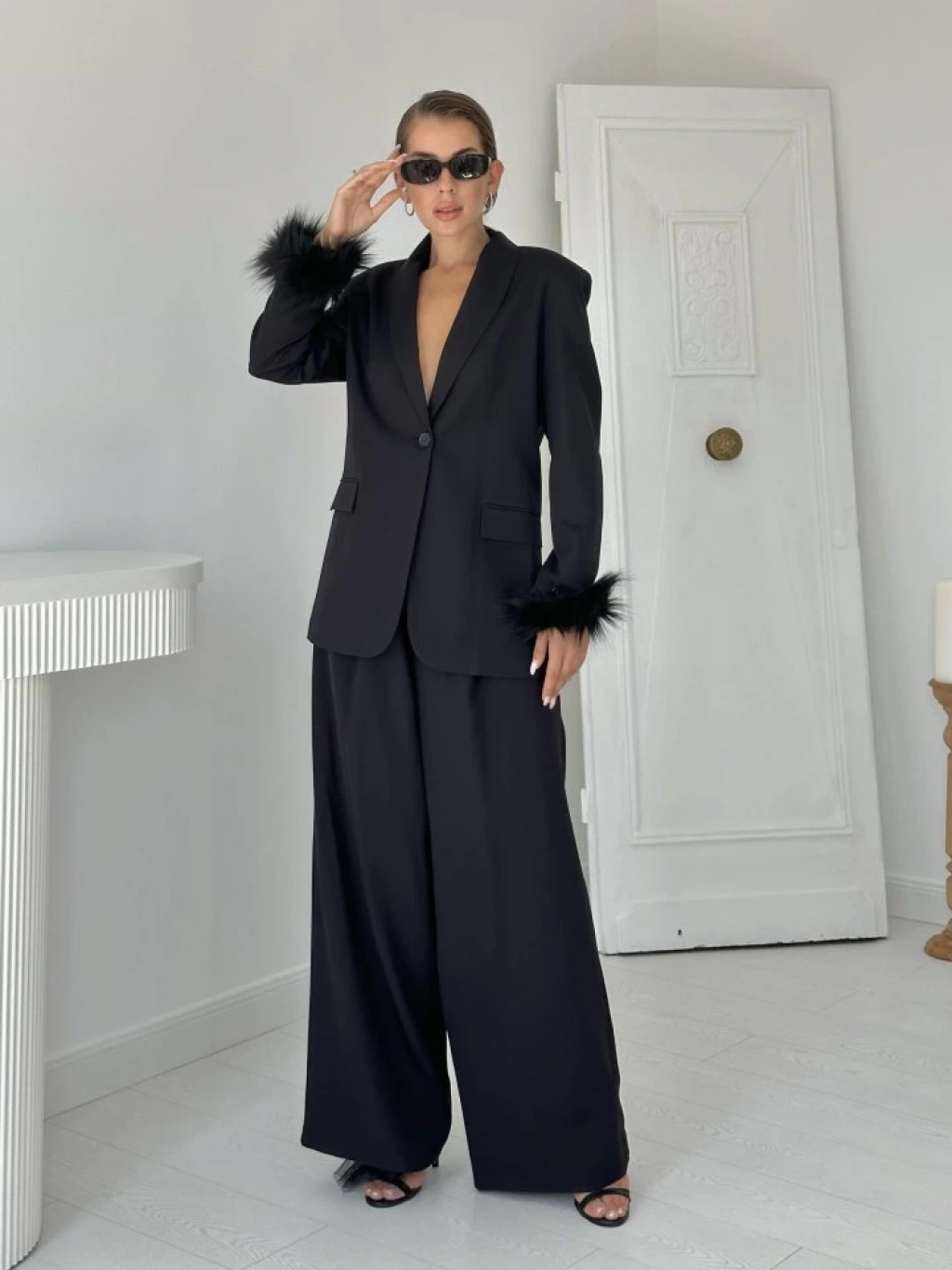 Siyah Kol Ucu Tüylü Ceket & Pantolon Takım