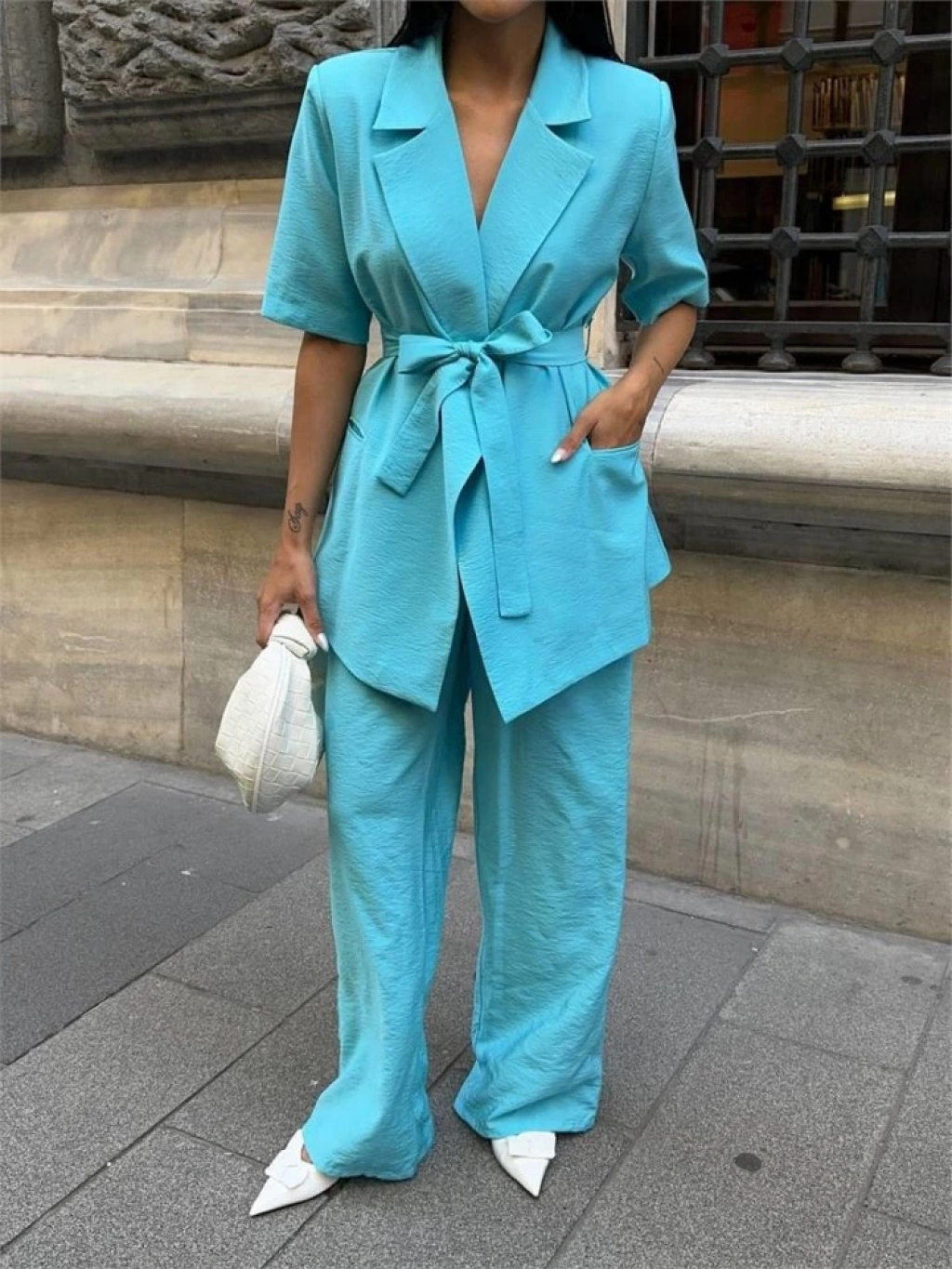 KISA KOL BAĞLAMA DETAYLI CEKET-PANTOLON TAKIM - Mavi