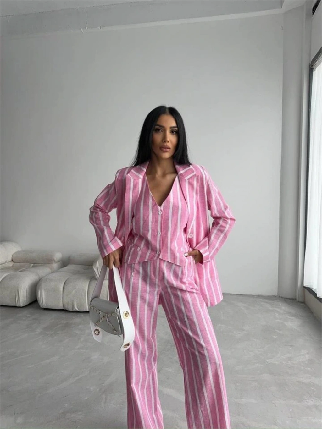 ÇİZGİLİ CEKET KETEN - Pembe