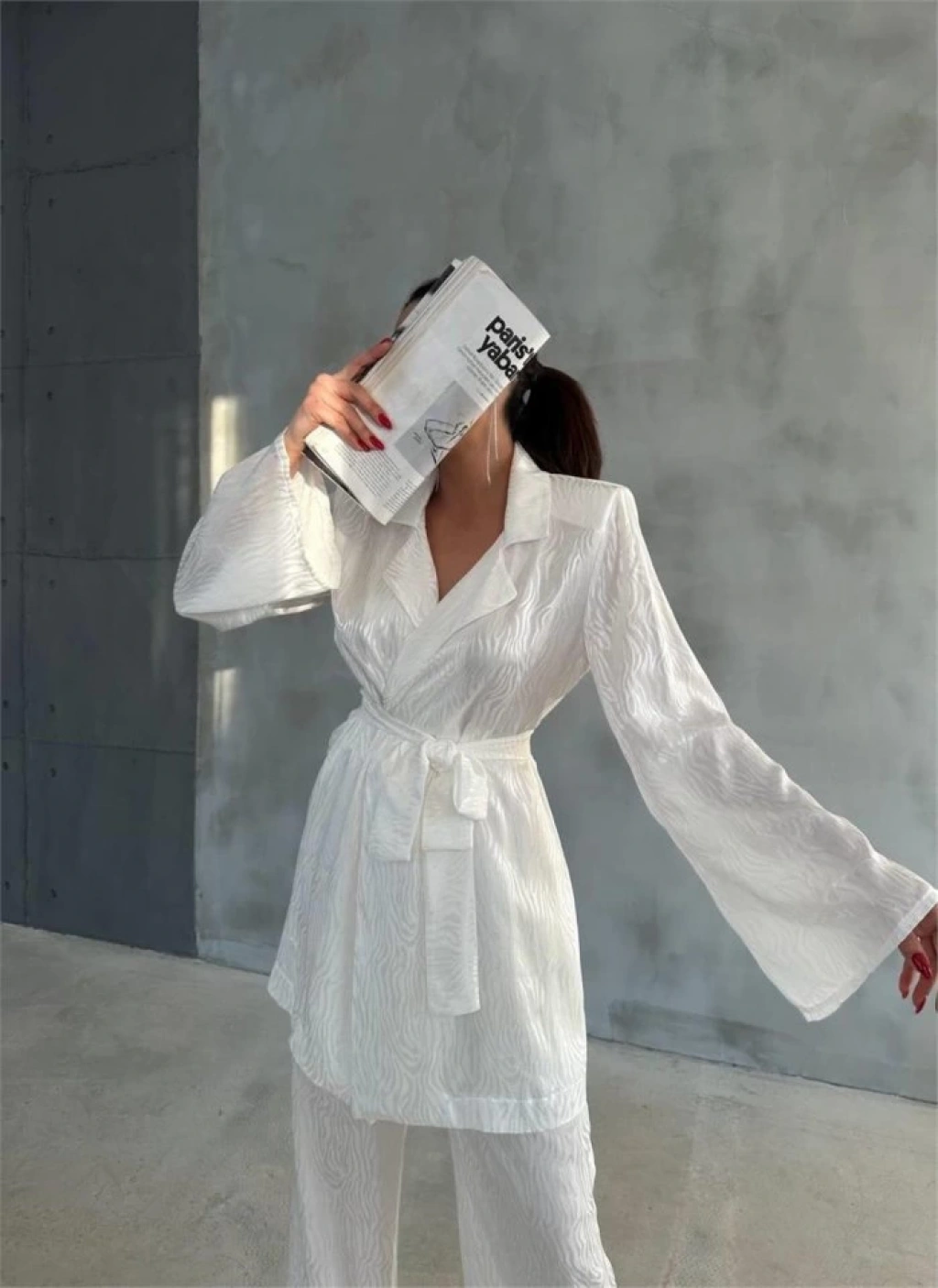 VİSKON JAKARLI BAĞLAMALI GÖMLEK - PANTOLON TAKIM - Beyaz