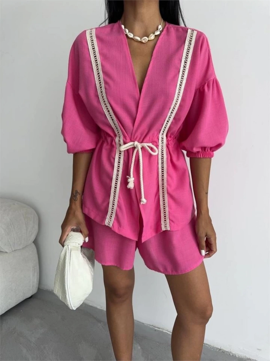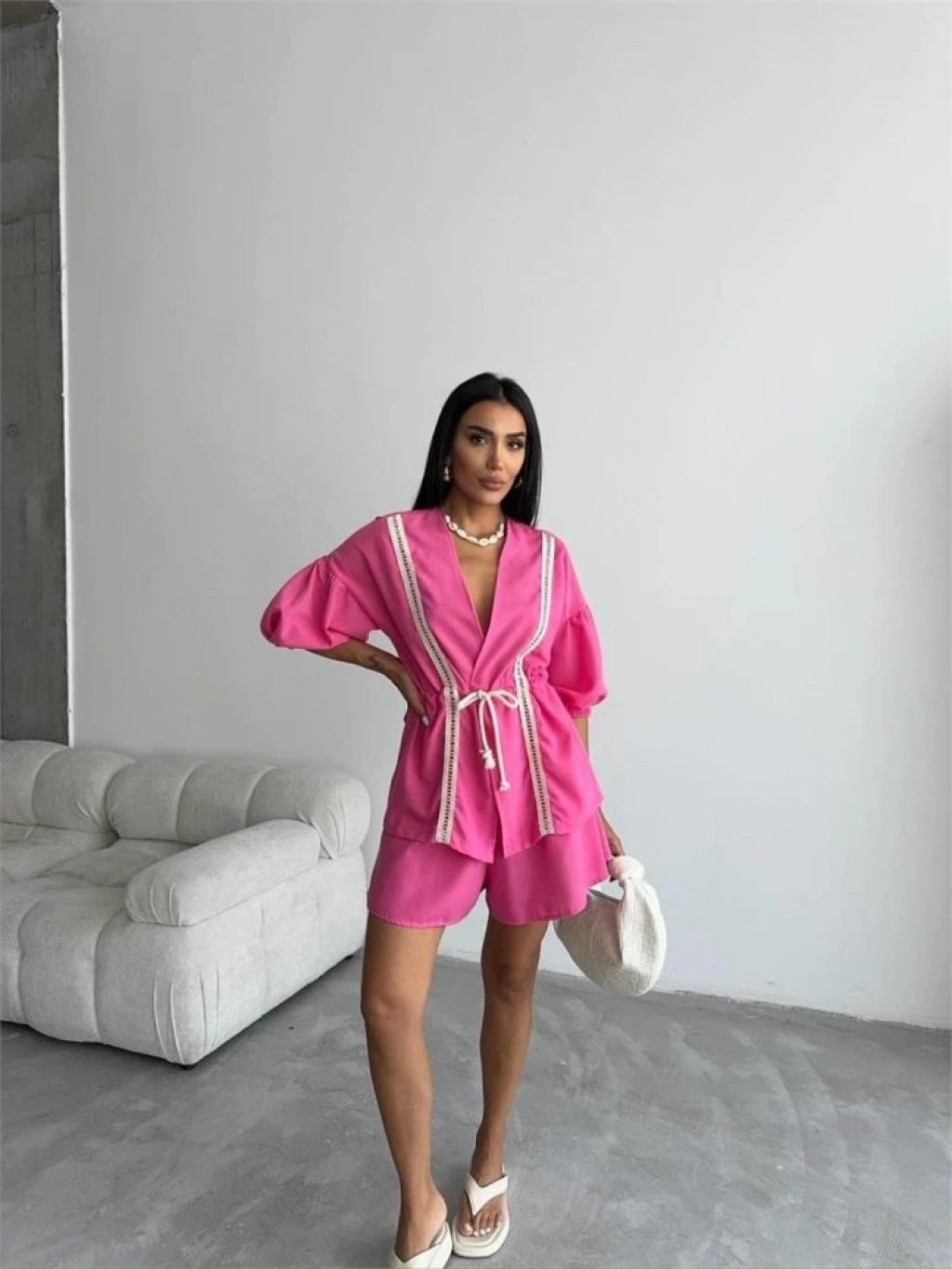 KETEN BEL BÜZGÜLÜ BLUZ-PANTOLON TAKIM - Fuşya