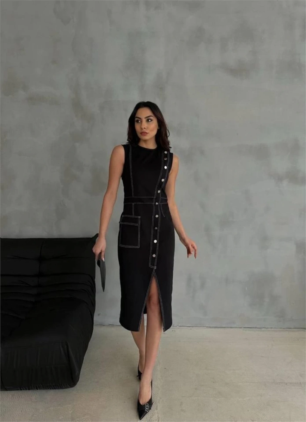GABARDİN KALEM ELBİSE DÜĞME VE YIRTMAÇ DETAYLI - Bej