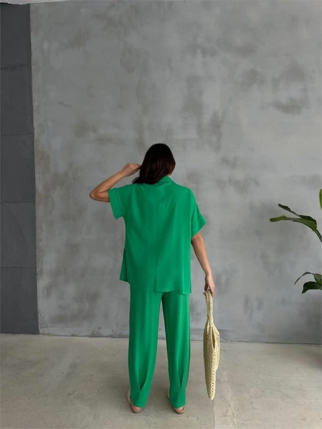 OMUZ MİDYE SIRALI BLUZ - PAÇA PENSLİ PANTOLON TAKIM - Yeşil