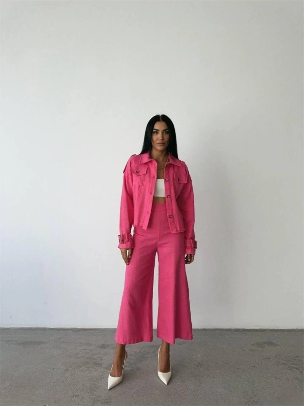 KETEN PÜSKÜL DETAYLI GÖMLEK-PANTOLON TAKIM - Fuşya