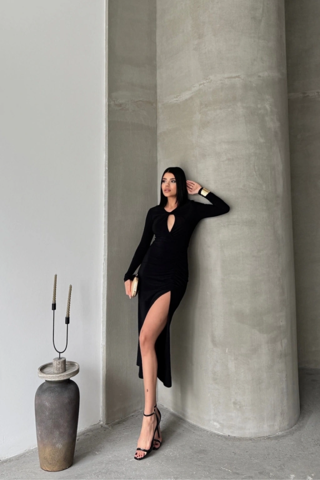SANDY ELBİSE BÜZGÜ DETAYLI - Siyah