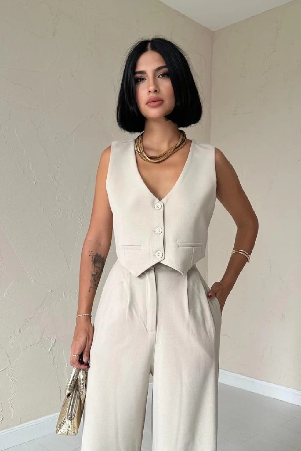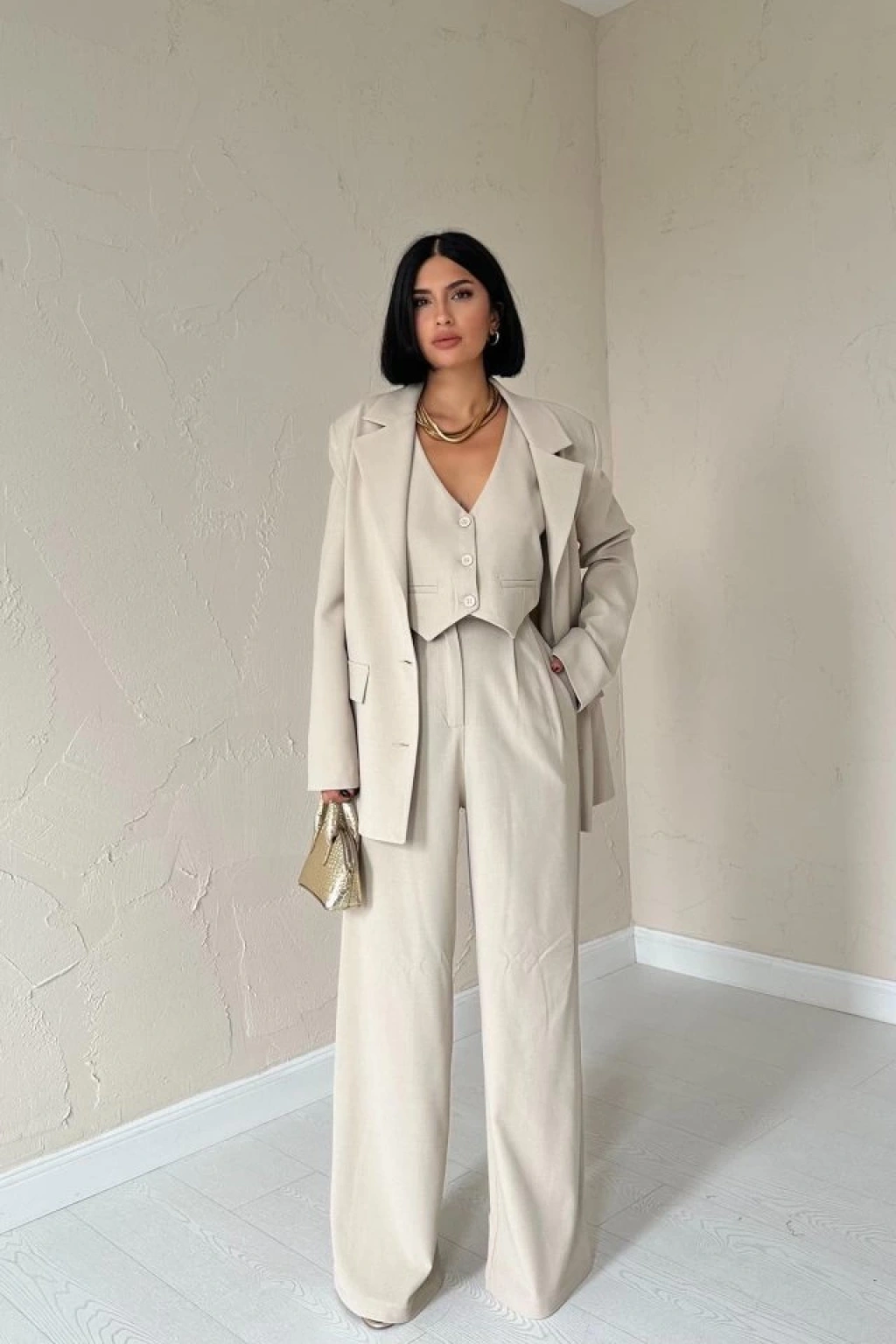 Bej Klas Ceket Ve Yelek Ve Pantolon Takım