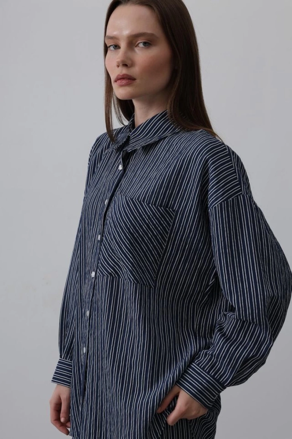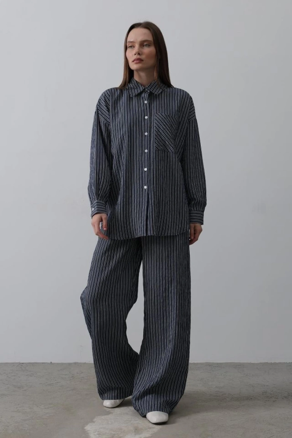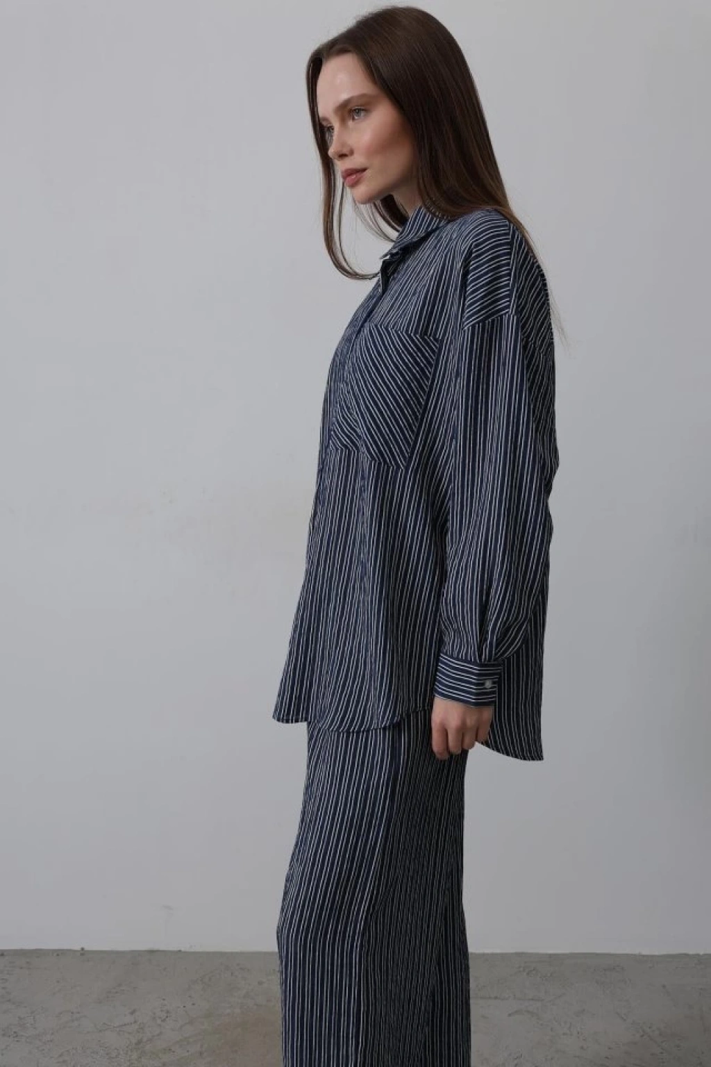 Çizgili Cep Detaylı Oversize Takım - Lacivert