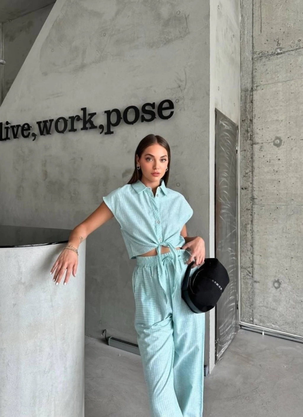 ÇİZGİLİ KETEN KOLSUZ CROP PANTOLON TAKIM - Yeşil