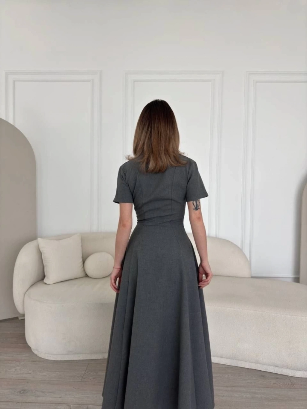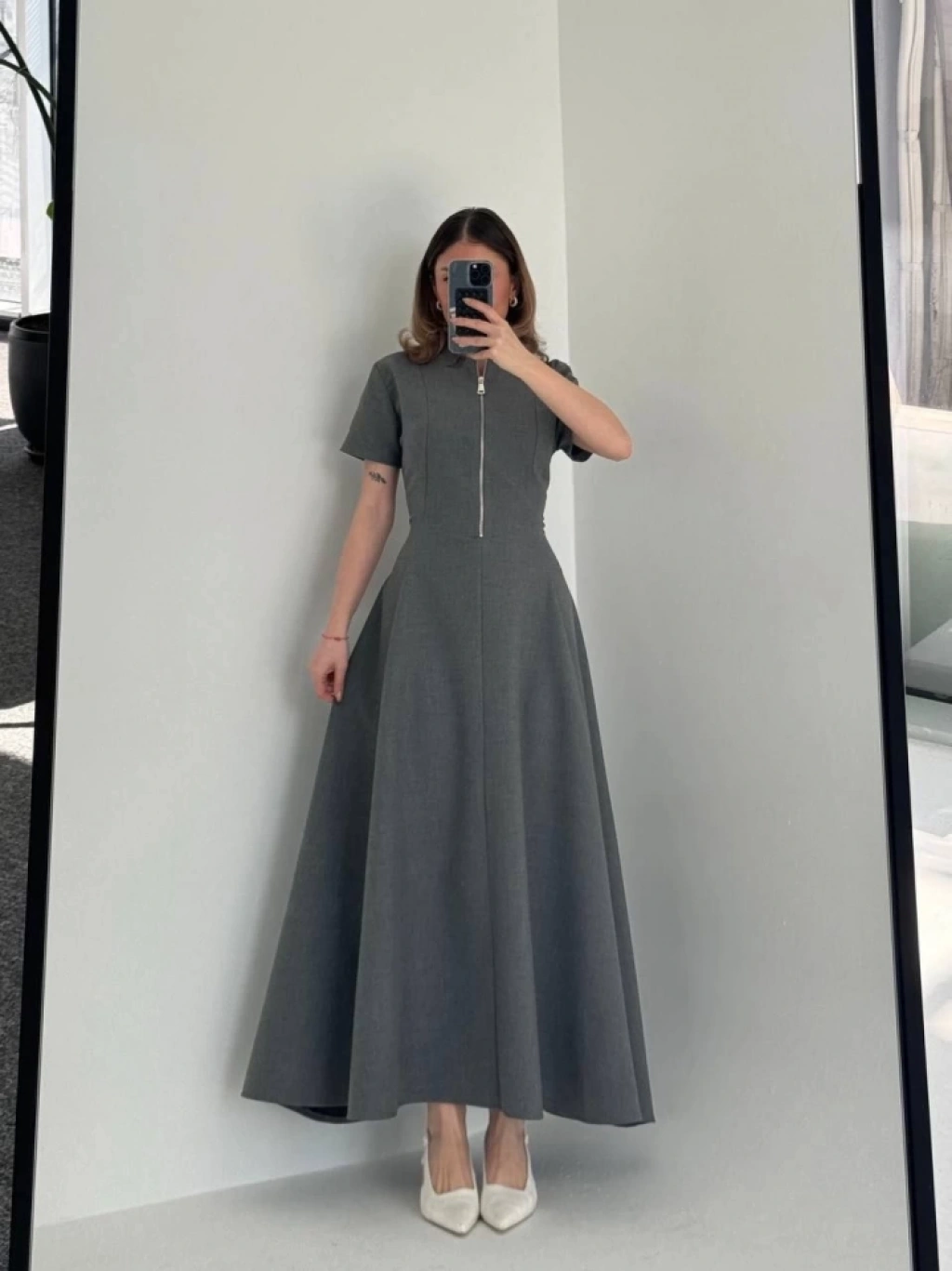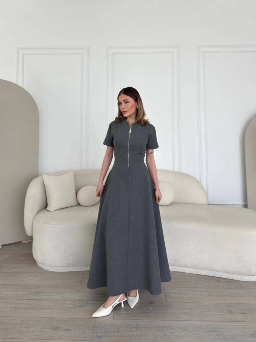 Kısa Kollu Önden Fermuarlı Çan Etekli Uzun Elbise - Antrasit