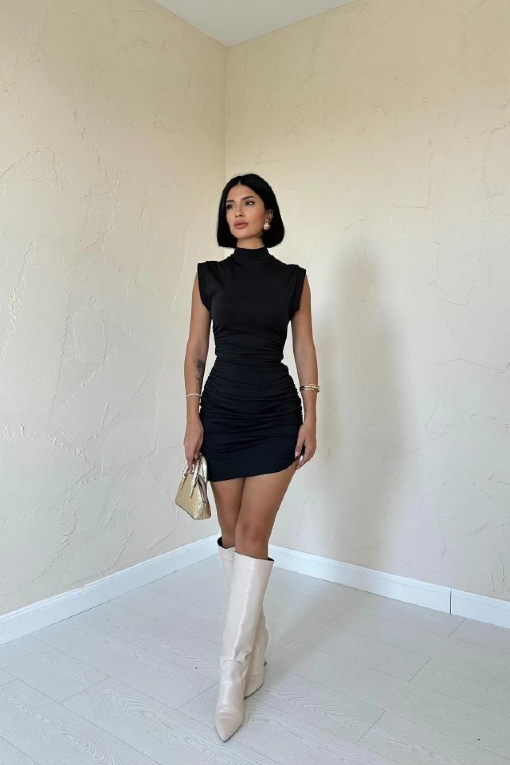 Siyah Büzgülü Kolsuz Elbise