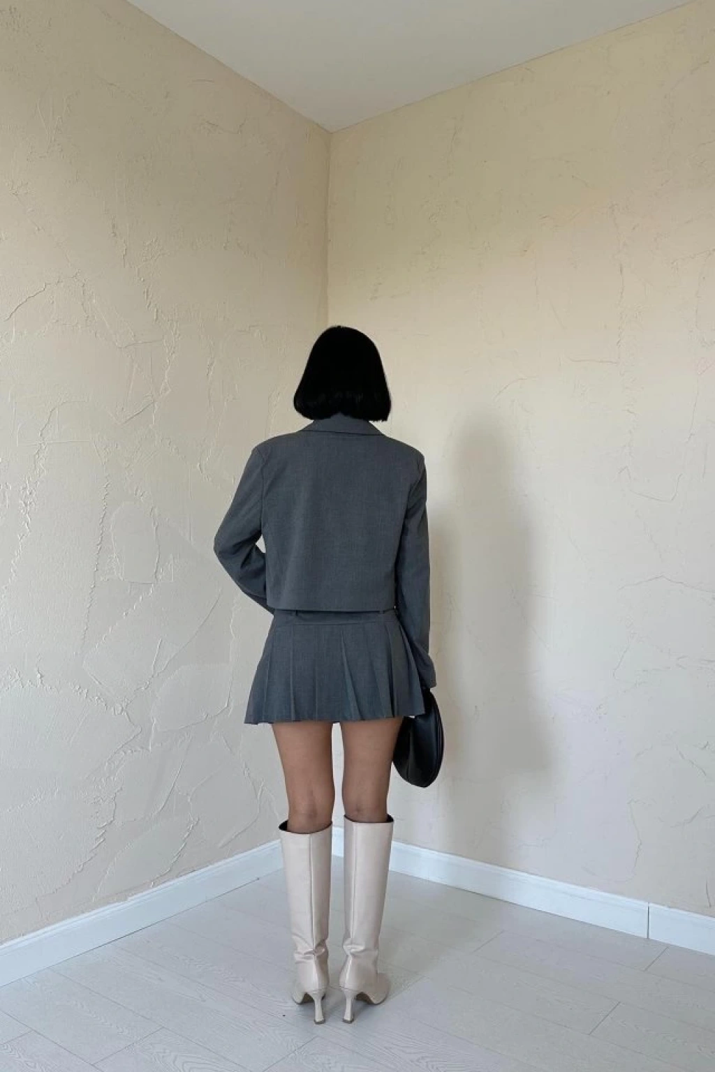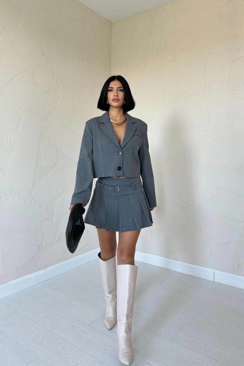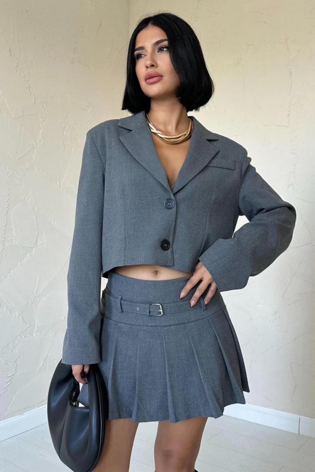 Gri Bomber Ceket Ve Pileli Etek Takım