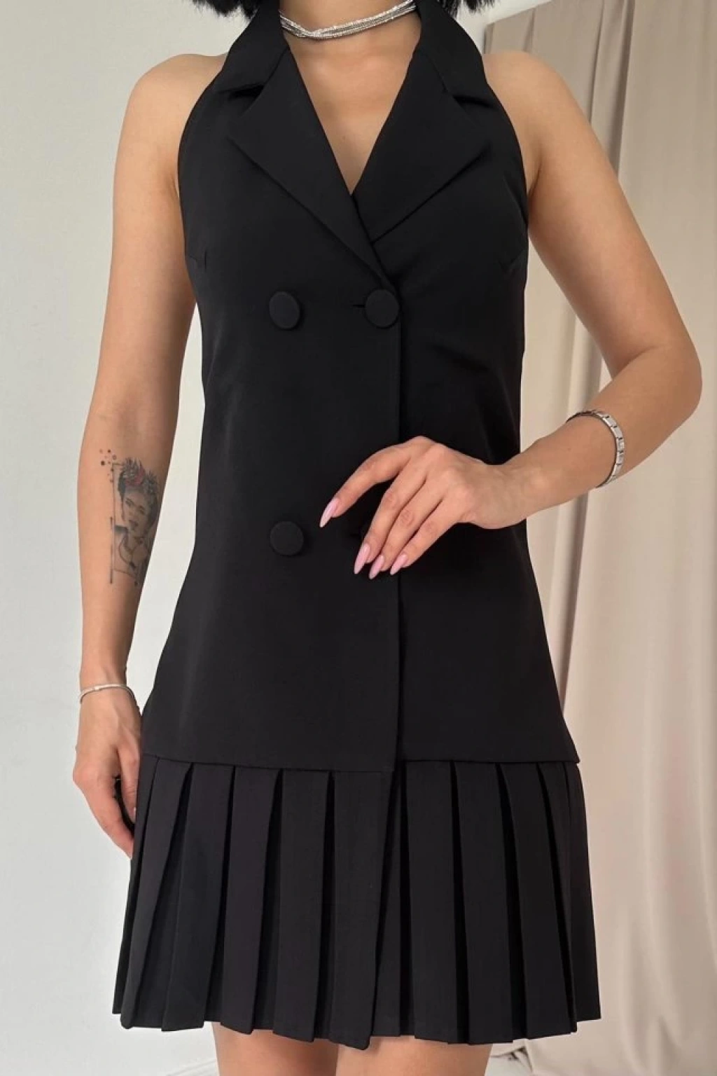 Siyah Sırtı Açık Ceket Yakalı Elbise