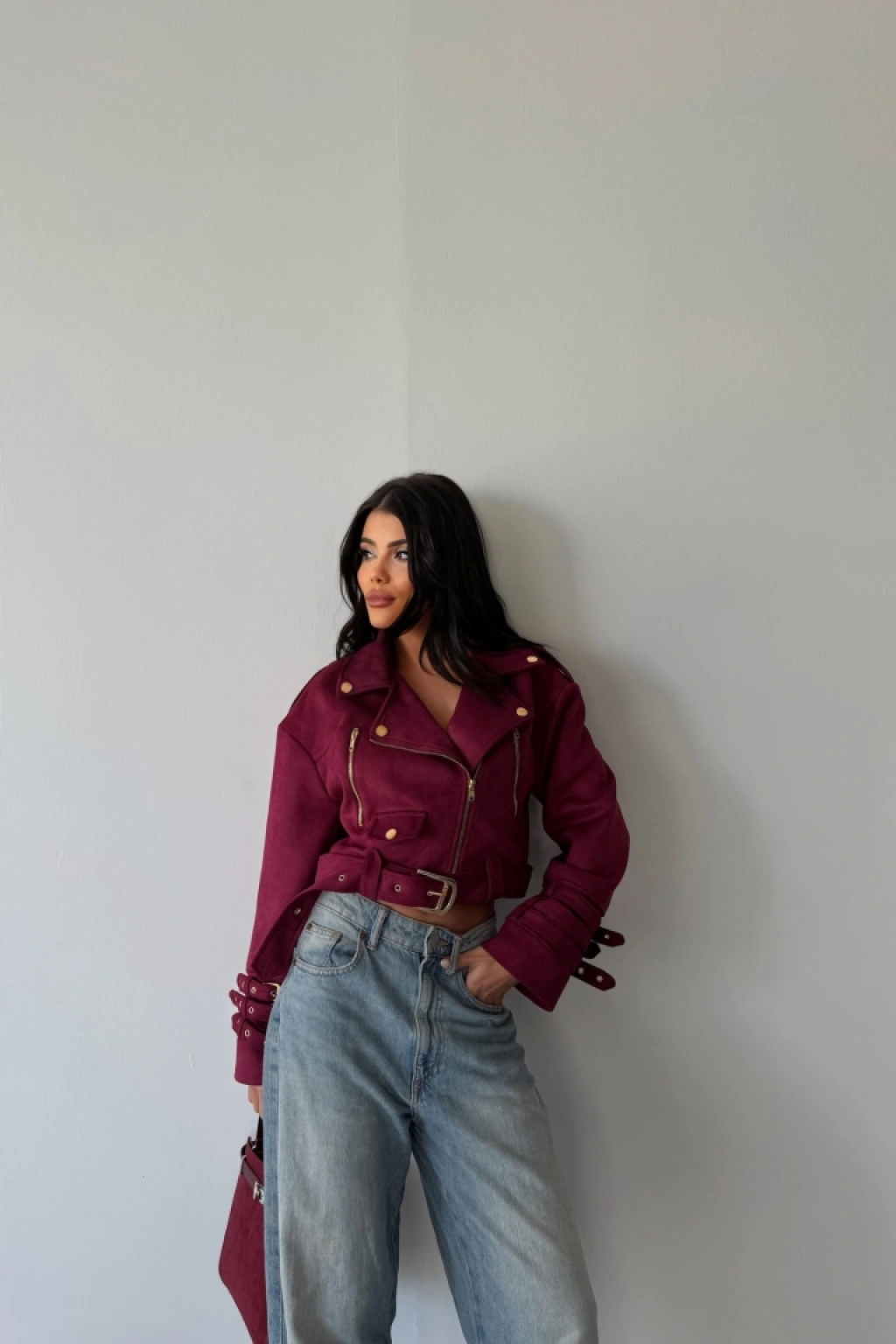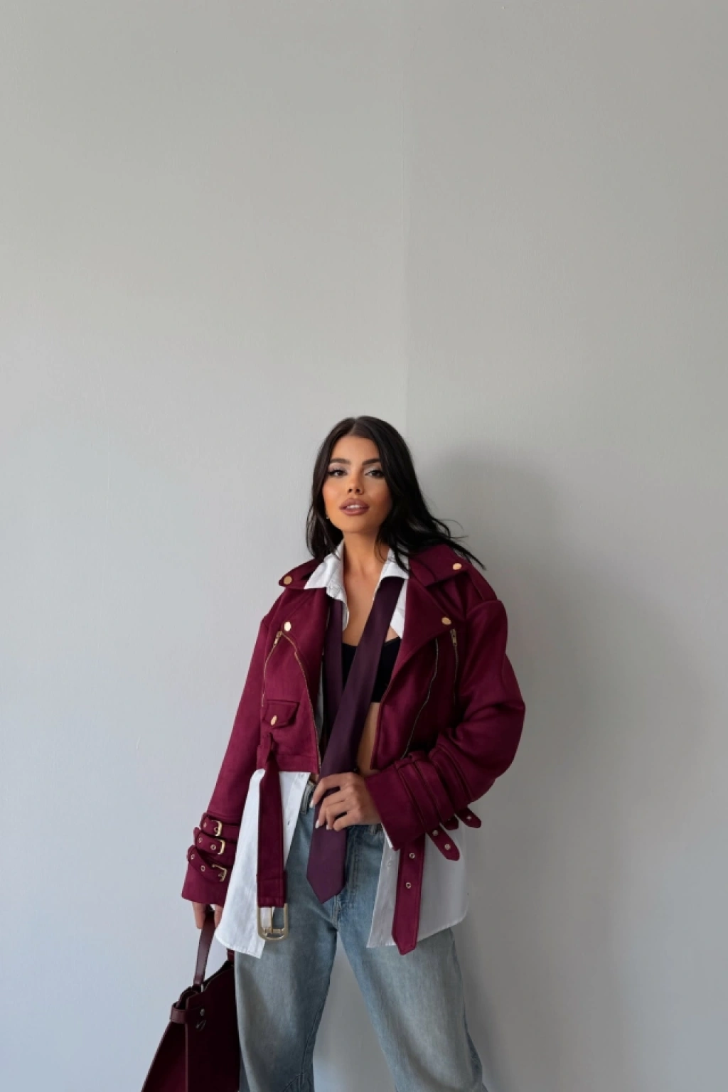 SÜET CROP CEKET KOL 3 KEMER DETAYLI - Bordo