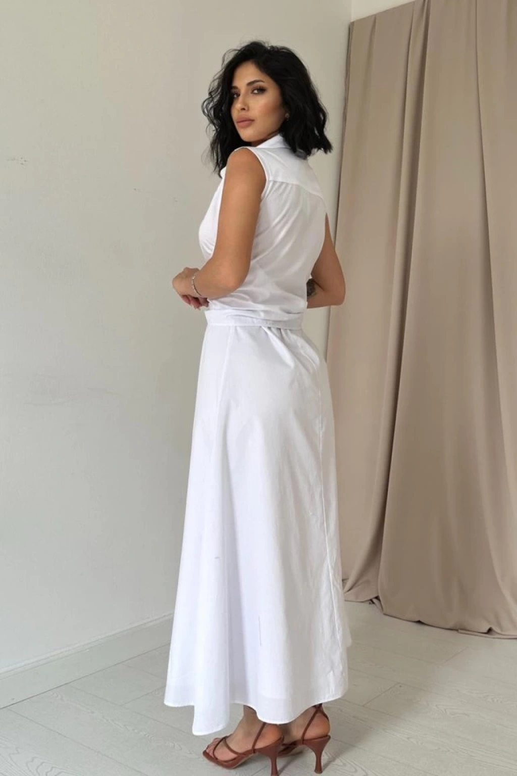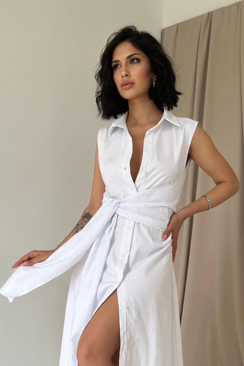 Beyaz Gömlek Yaka Bağlamalı Elbise