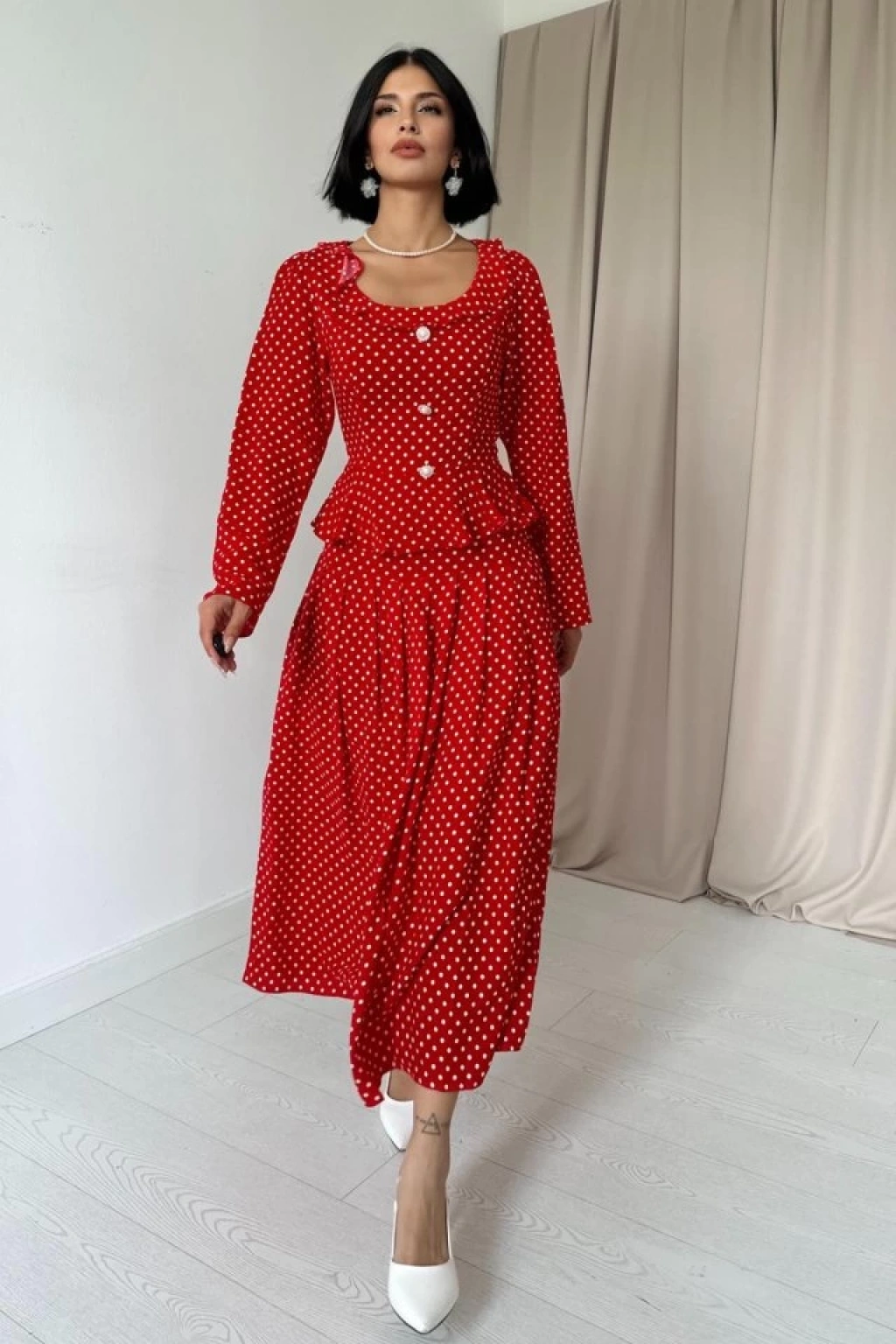 Kırmızı Puantiye Desenli Volanlı Elbise