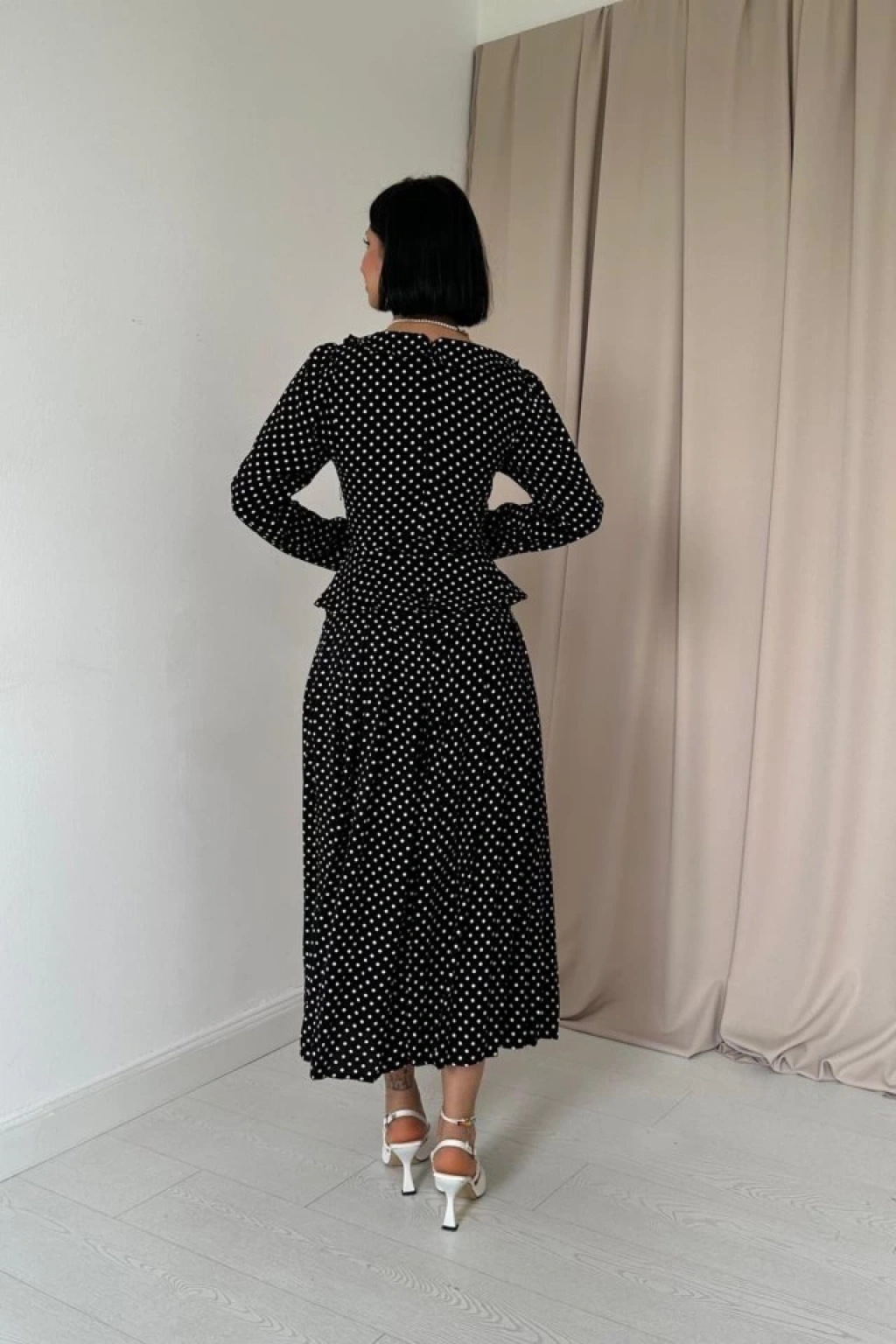 Siyah Puantiye Desenli Volanlı Elbise