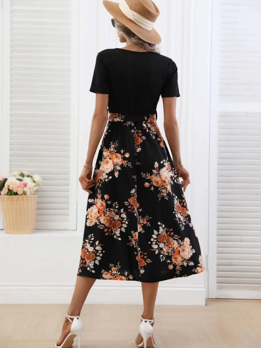Kadın Kısa Kollu V Yakalı üst Viskon Alt Süprem Midi Elbise