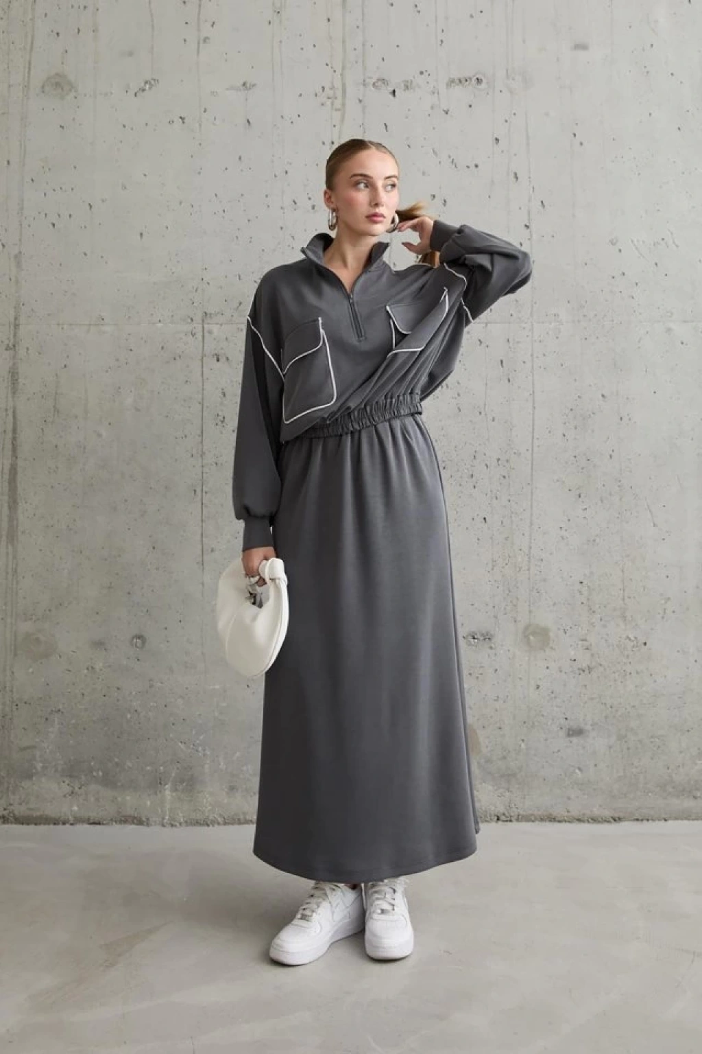 Füme Biyeli Sweatshirt Ve Etek Takım